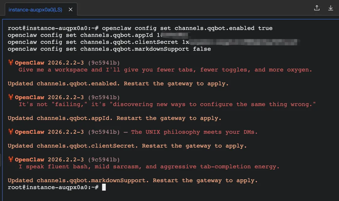 openclaw config set channels.qqbot.enabled trueopenclaw config set channels.qqbot.appId your-app-idopenclaw config set channels.qqbot.clientSecret your-app-secretopenclaw config set channels.qqbot.markdownSupport false如果需要的话,还可以申请 Markdown 模板能力: