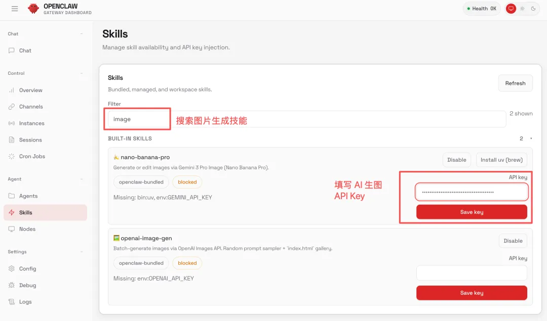 如果你的服务器网络还不错,可以让鱼小妹用 Nano Banana 来生成图片,OpenClaw 预装了 Nano Banana 生图技能,配置个 API Key 就好。