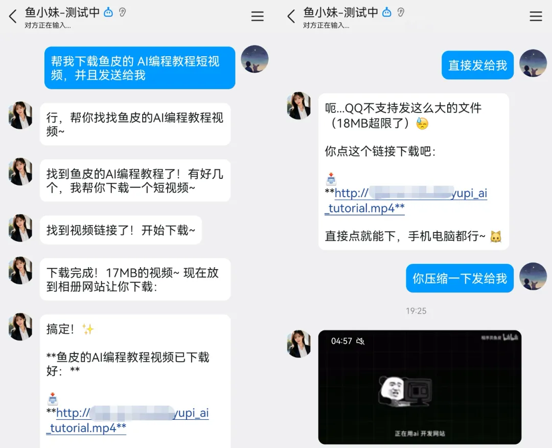 类似的思路,还可以让 AI 发送视频。比如从网络搜索并下载视频,或者调用 AI 大模型生成视频。