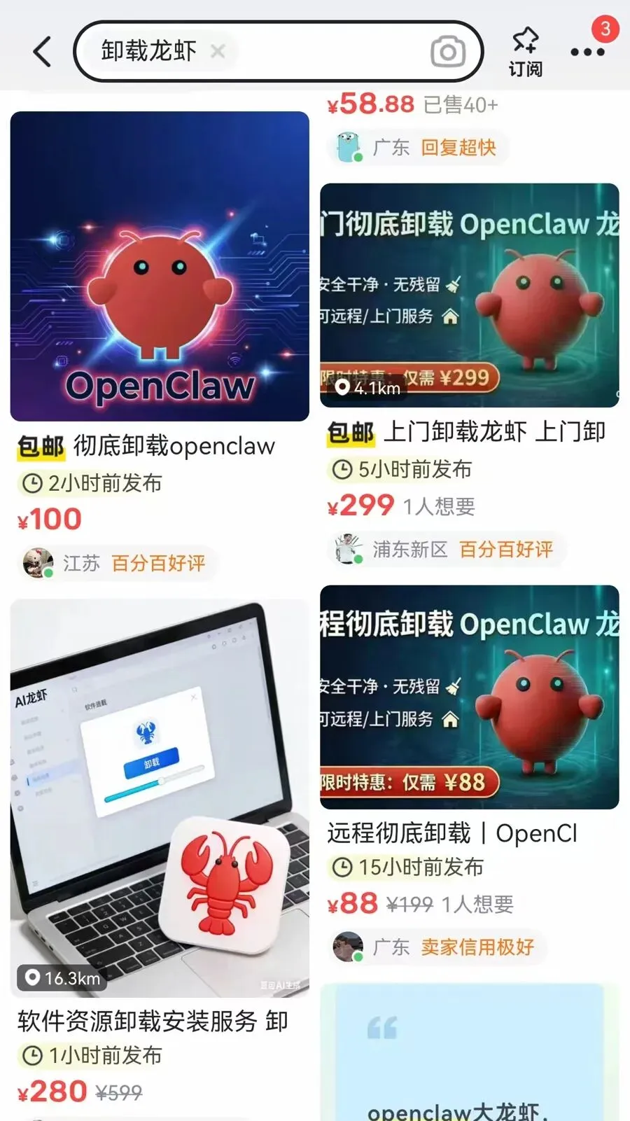于是, 荒诞的⼀幕出现了 。 3 ⽉ 10 ⽇ , 某⼆⼿交易平台赫然出现了 " 代卸载 OpenClaw"服务。