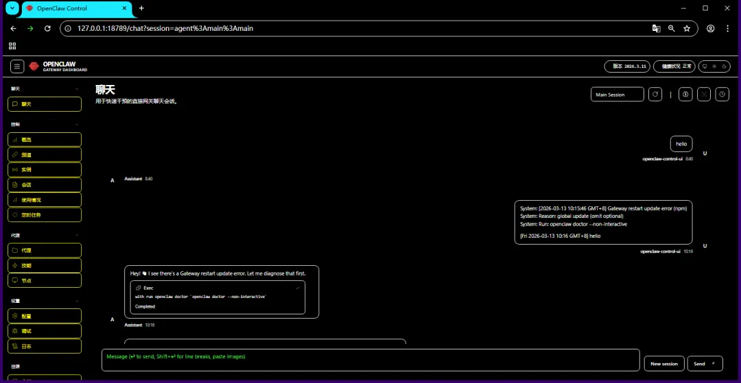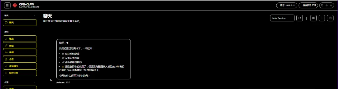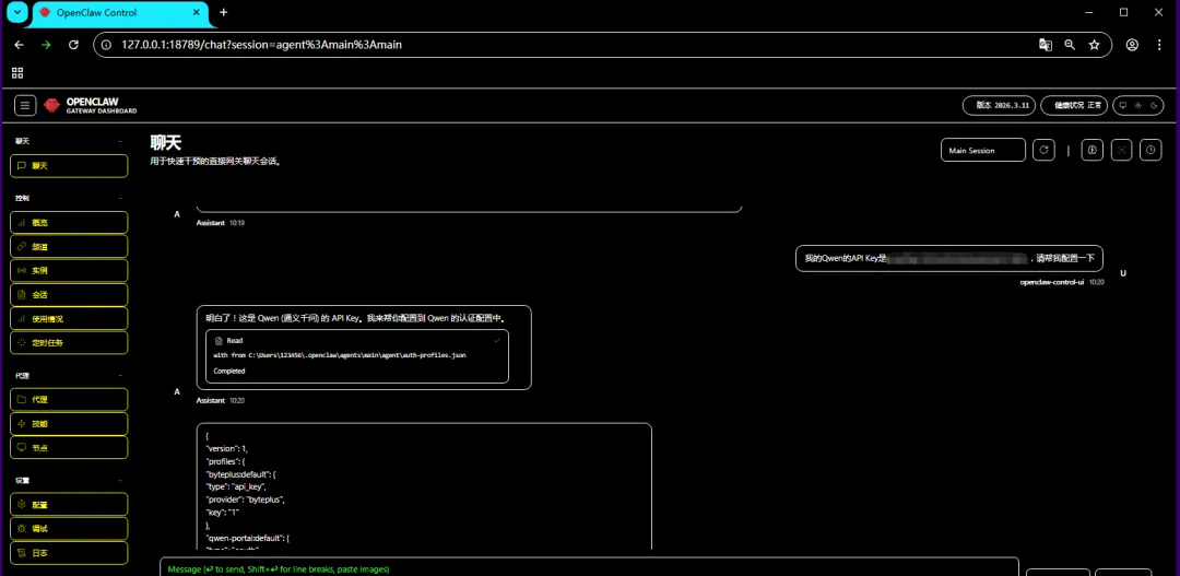 1打开Chrome/Edge浏览器,访问地址:http://localhost:18789/chat