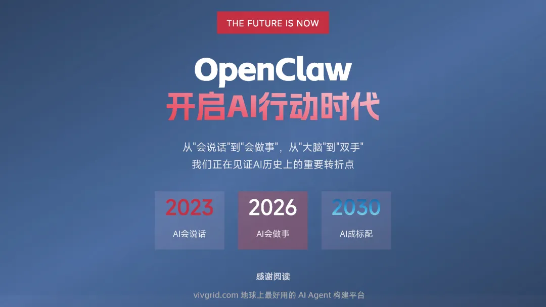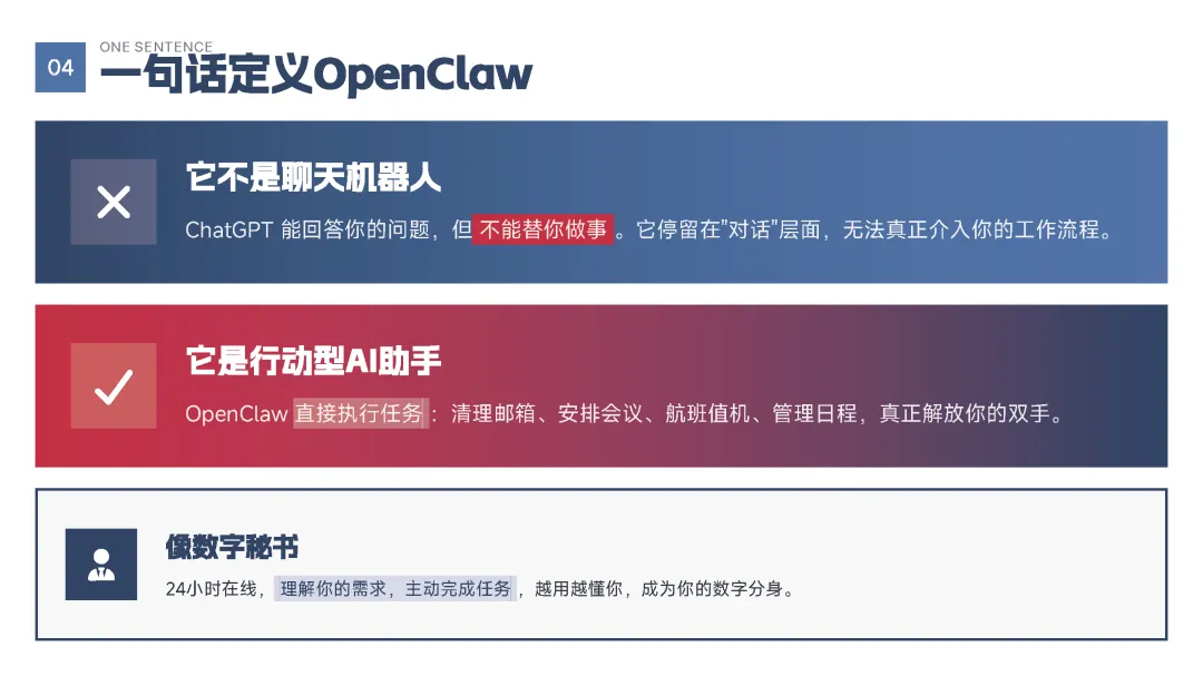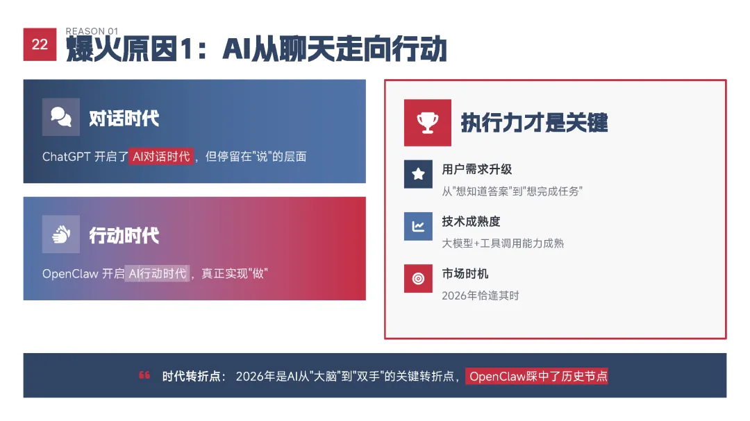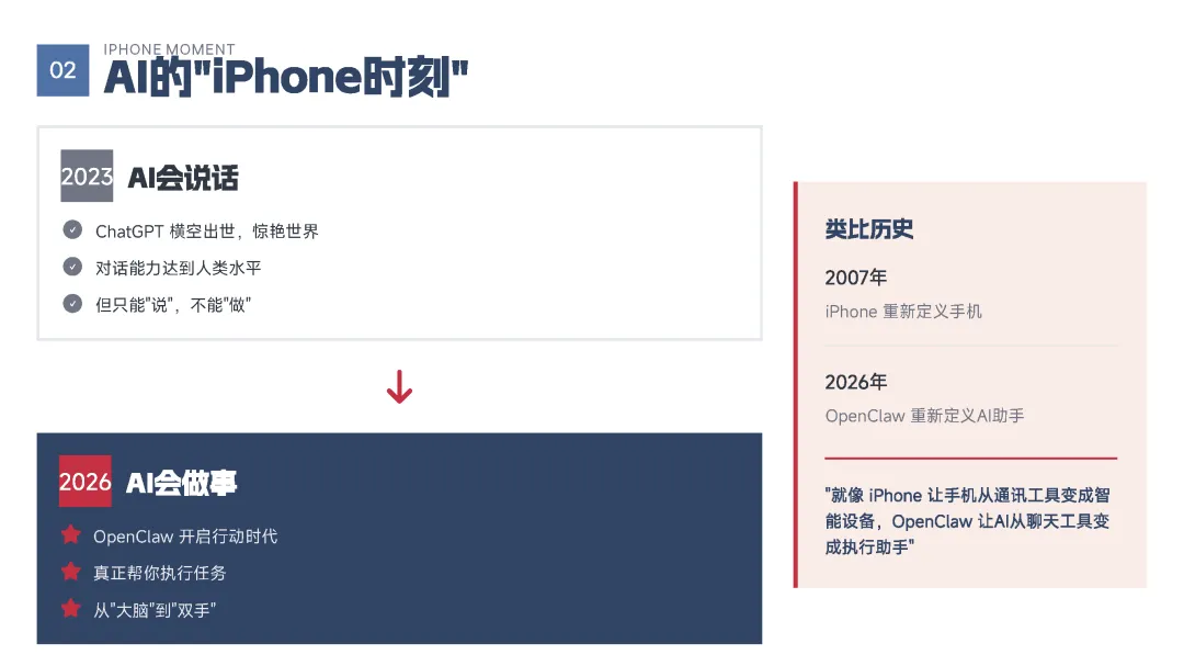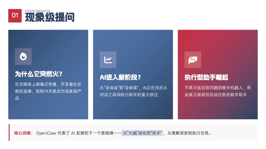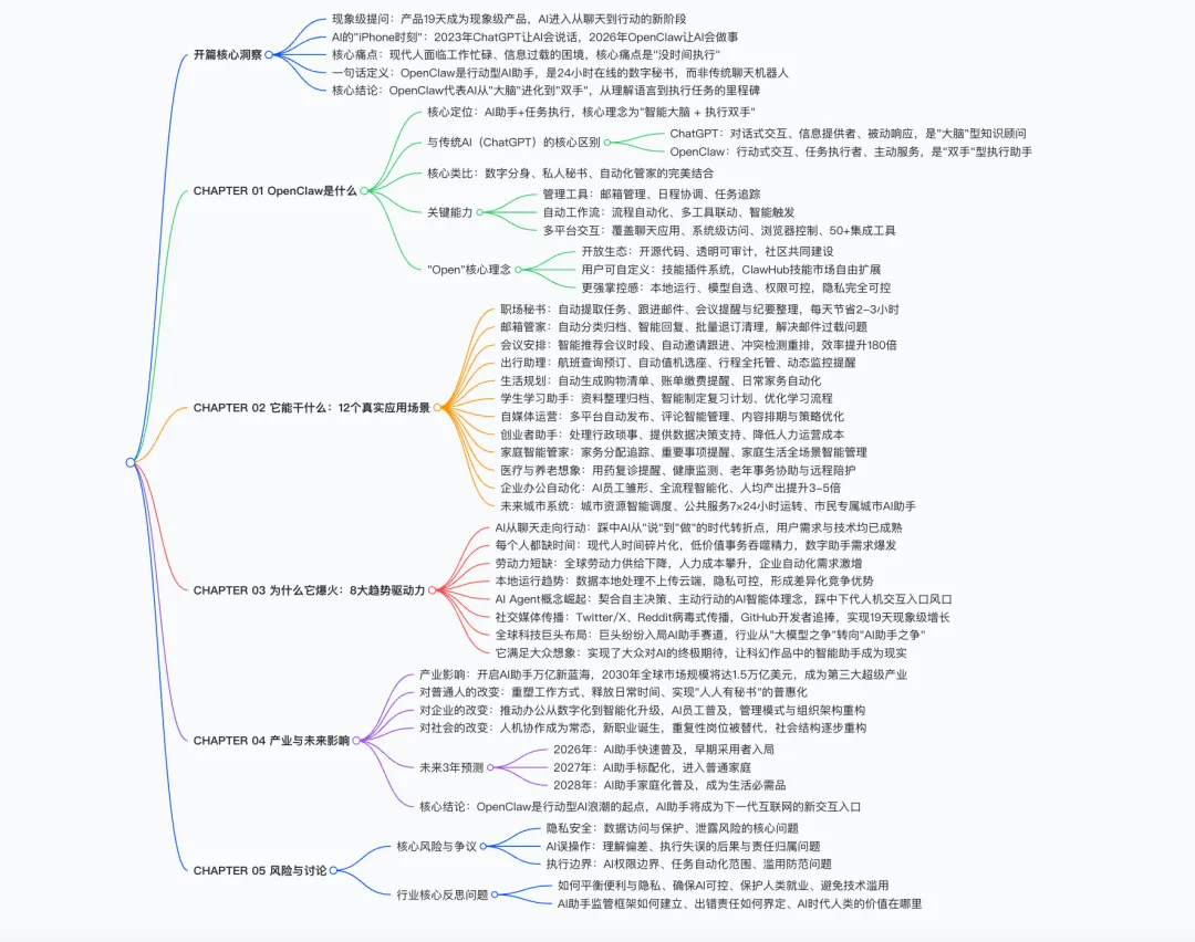 该手册核心围绕上线19天即成为现象级产品的OpenClaw展开全维度解读,明确其区别于传统对话式聊天机器人的核心定位——是兼具“智能大脑+执行双手”、可直接完成跨平台任务执行的行动型AI助手,拆解了产品的核心执行能力、开源开放与隐私可控的核心特性,以及覆盖个人、商业、社会领域的全场景落地价值,深度剖析了其踩中AI从对话走向行动的行业拐点、匹配大众效率与隐私核心需求等爆火的底层逻辑,同时预判了行动型AI将成为万亿级新赛道的产业前景,阐述了其对个人、企业、社会带来的全方位变革,也理性探讨了技术发展背后的隐私安全、AI误操作、权限边界等核心风险与行业需要共同面对的监管、责任界定等关键命题。 【核心内容框架速览】