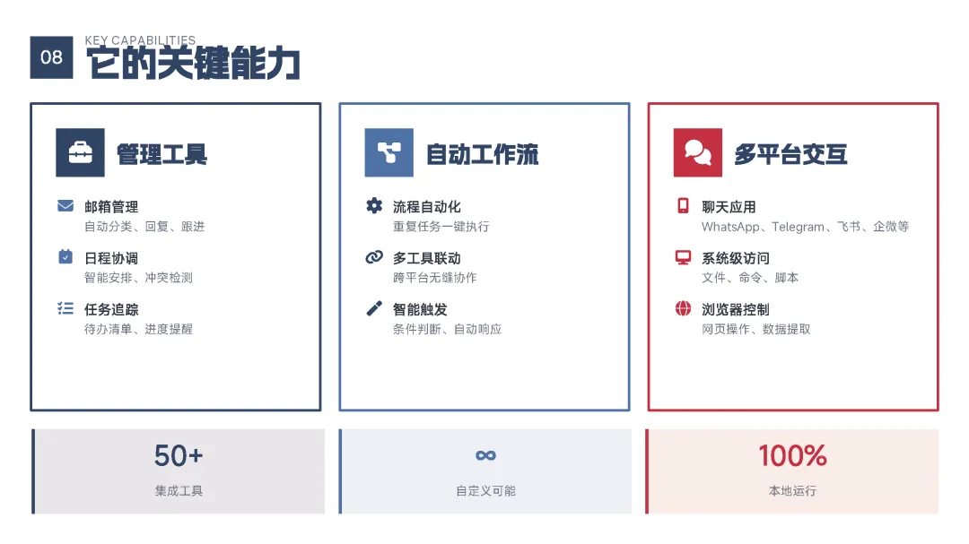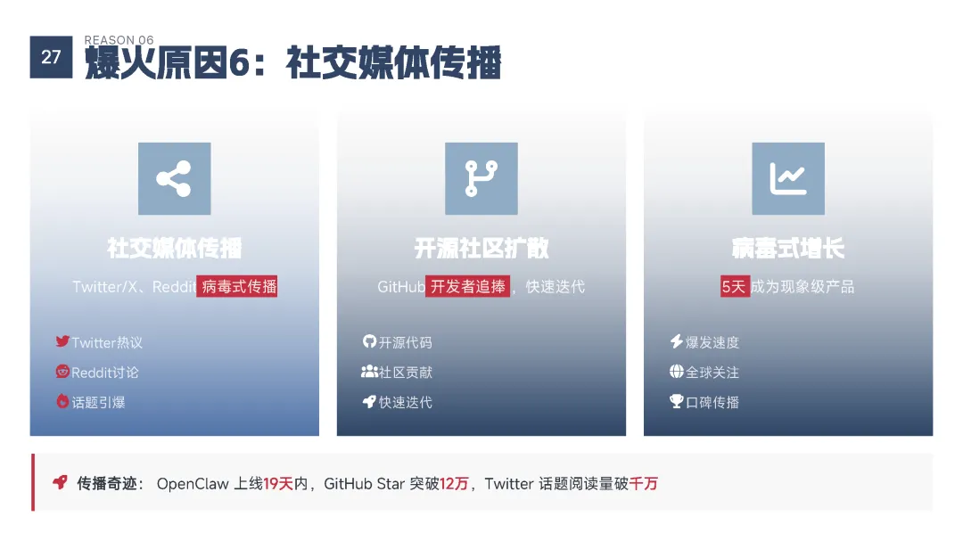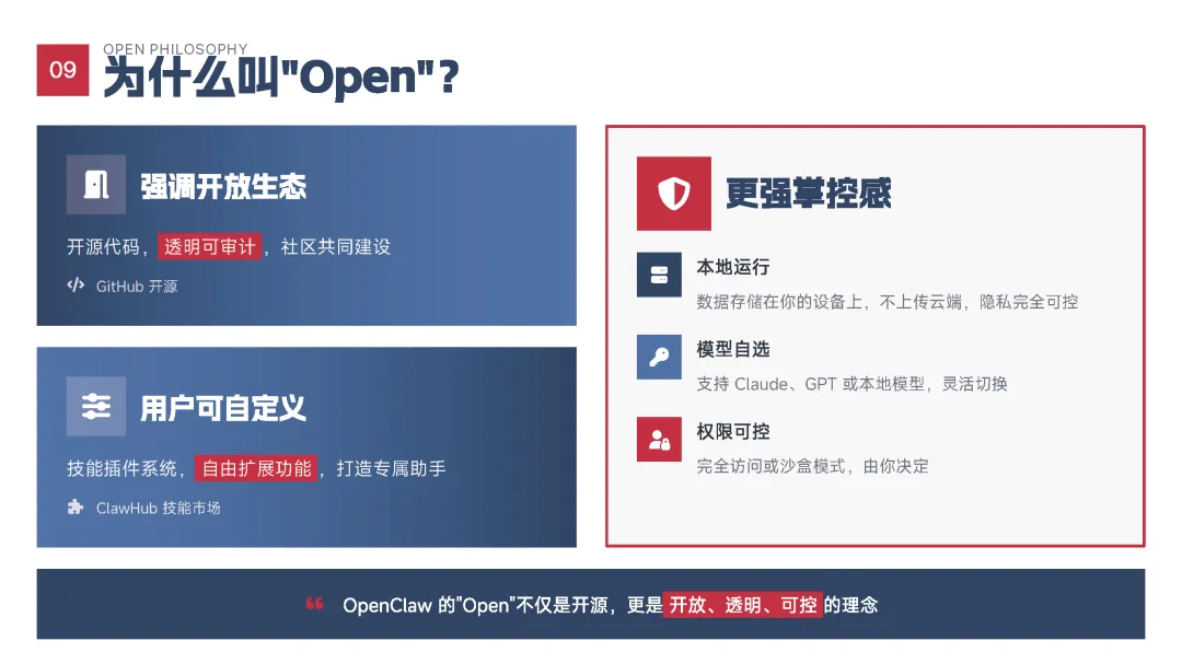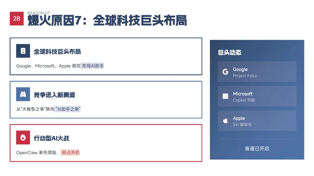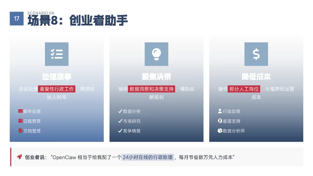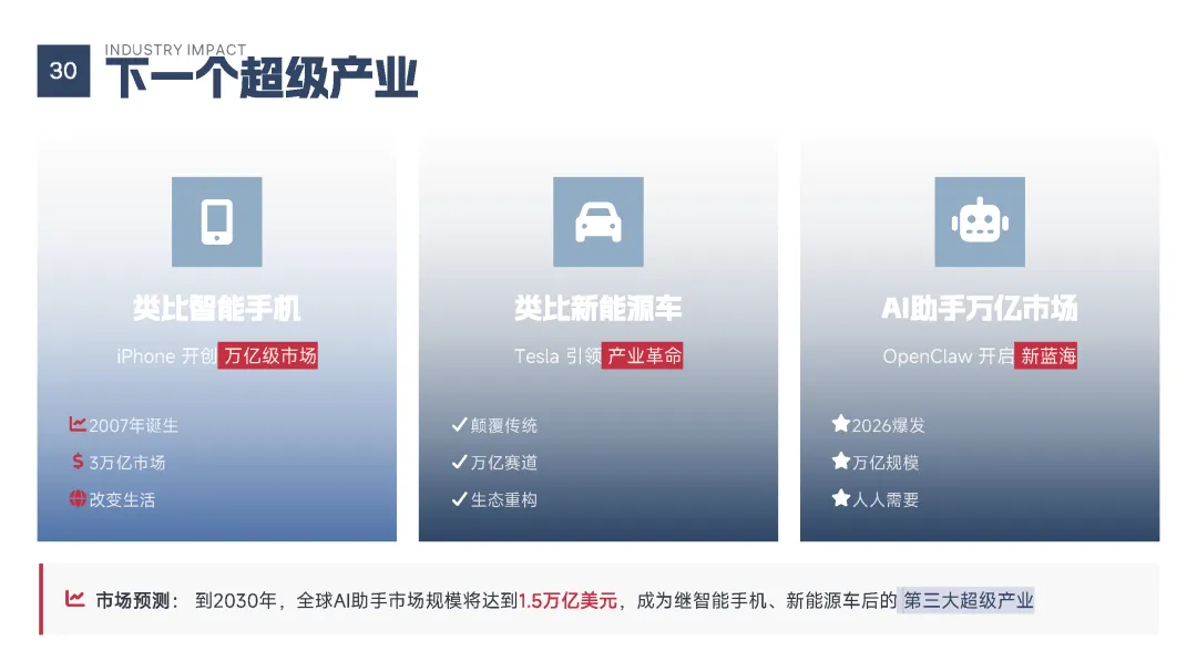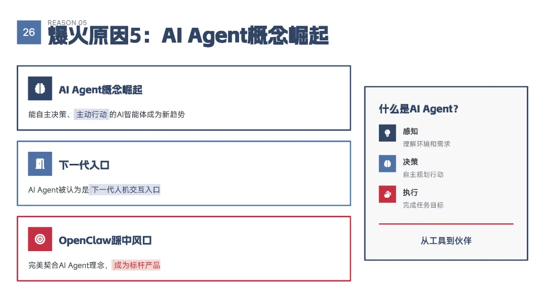 该手册核心围绕上线19天即成为现象级产品的OpenClaw展开全维度解读,明确其区别于传统对话式聊天机器人的核心定位——是兼具“智能大脑+执行双手”、可直接完成跨平台任务执行的行动型AI助手,拆解了产品的核心执行能力、开源开放与隐私可控的核心特性,以及覆盖个人、商业、社会领域的全场景落地价值,深度剖析了其踩中AI从对话走向行动的行业拐点、匹配大众效率与隐私核心需求等爆火的底层逻辑,同时预判了行动型AI将成为万亿级新赛道的产业前景,阐述了其对个人、企业、社会带来的全方位变革,也理性探讨了技术发展背后的隐私安全、AI误操作、权限边界等核心风险与行业需要共同面对的监管、责任界定等关键命题。 【核心内容框架速览】