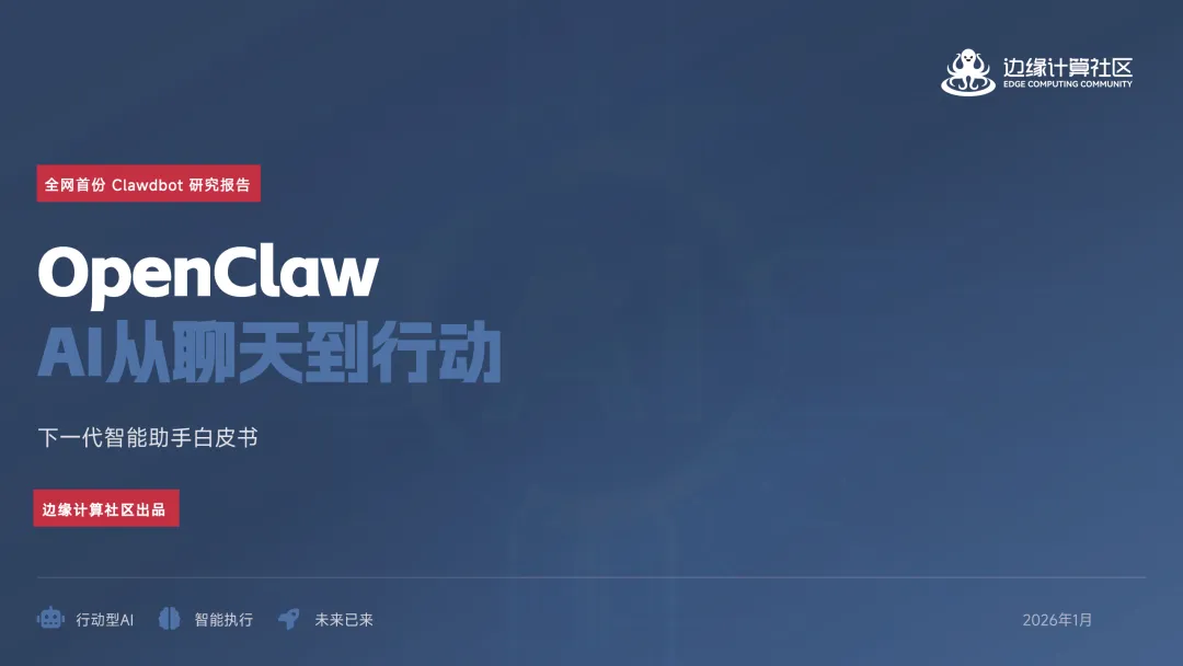 《OpenClaw AI手册指南(2026年)》(又名全网首份OpenClaw AI从聊天到行动下一代智能助手白皮书)由边缘计算社区于2026年1月发布。