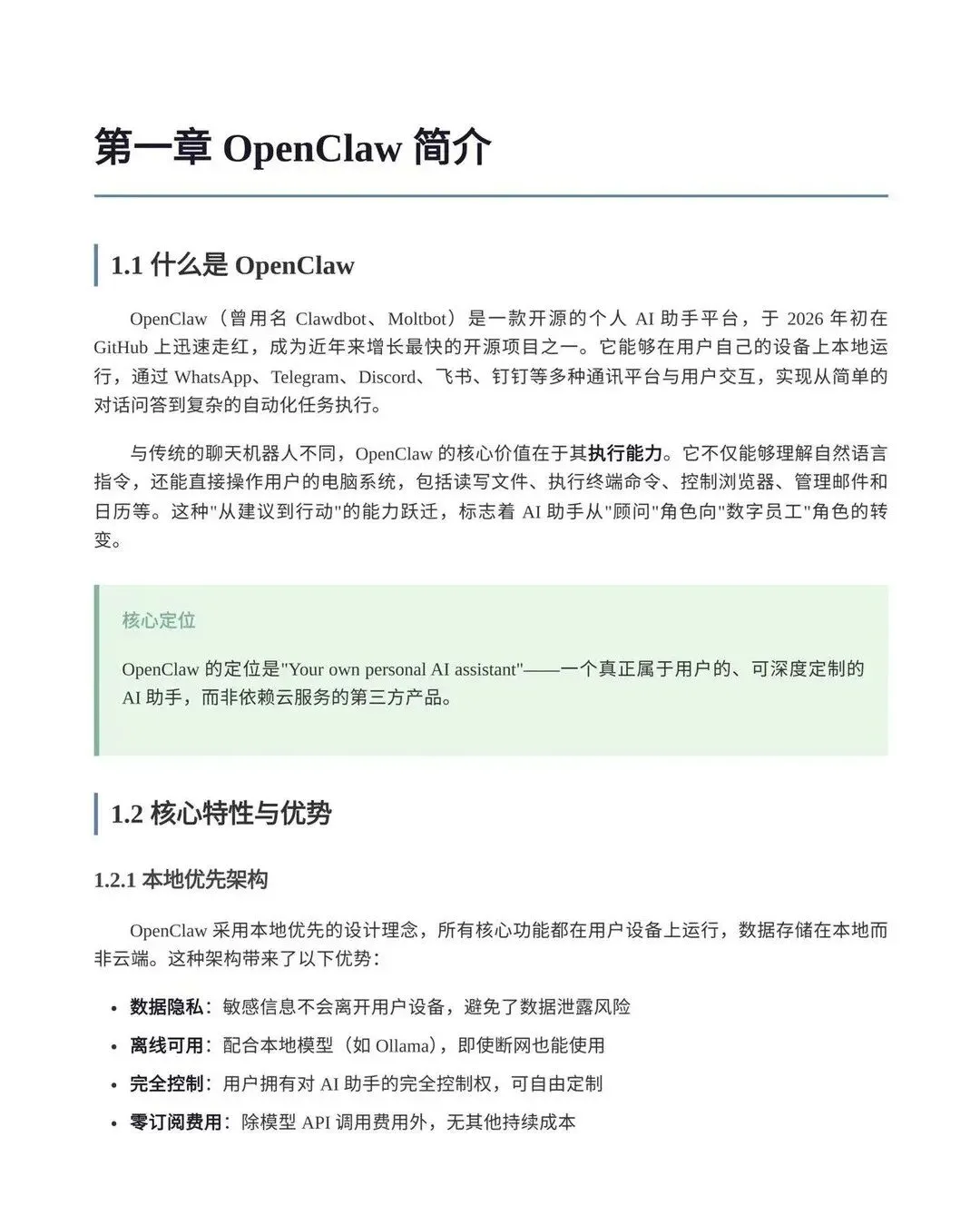 《OpenClaw完全使用手册》是一份全面介绍开源个人AI助手平台OpenClaw的技术文档,涵盖其核心功能、部署方式、使用场景及安全实践。可在本地设备运行,支持通过Telegram、WhatsApp、飞书、钉钉等通讯平台交互,具备文件处理、浏览器自动化、系统命令执行、多平台集成等强大能力。