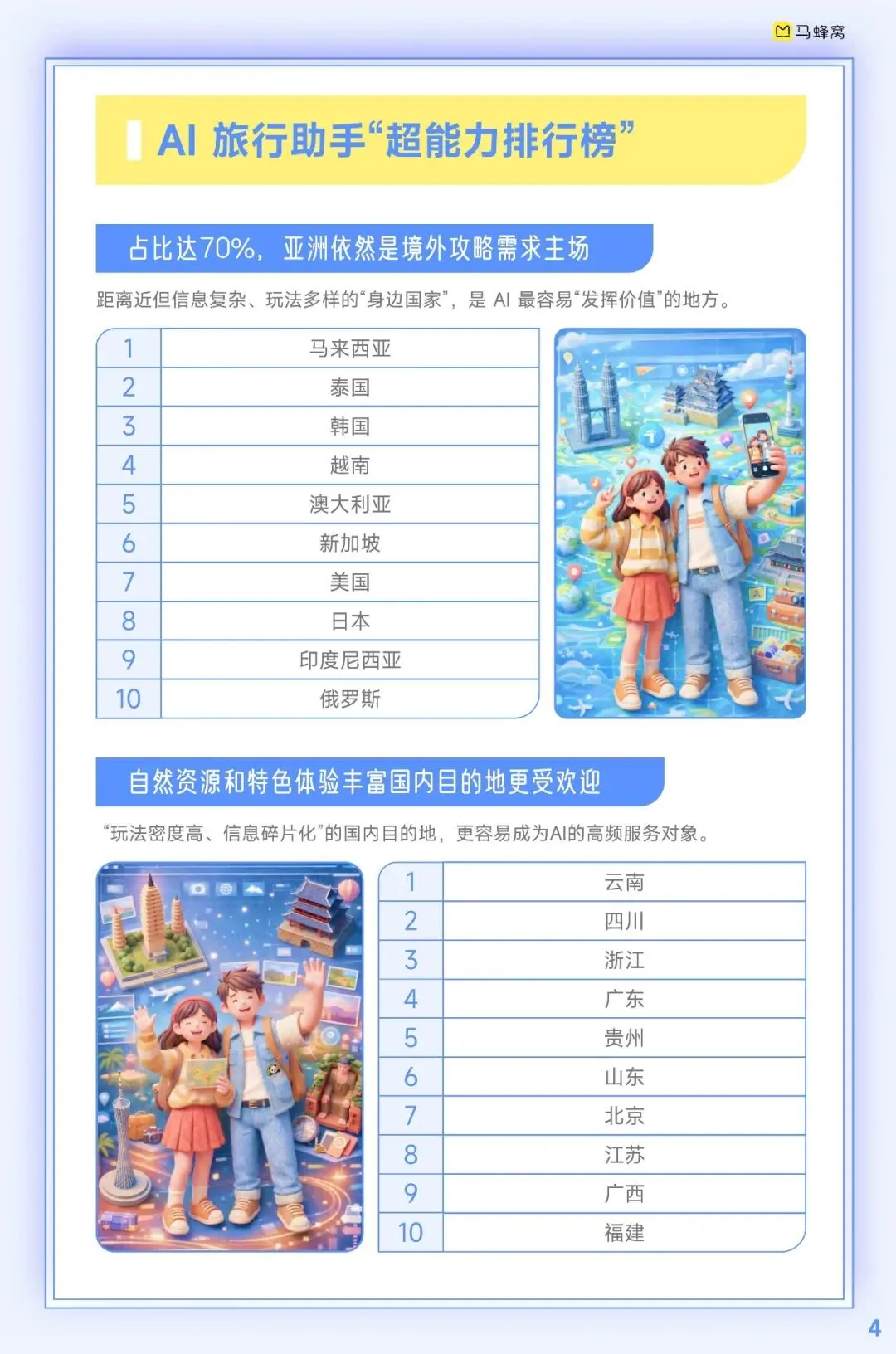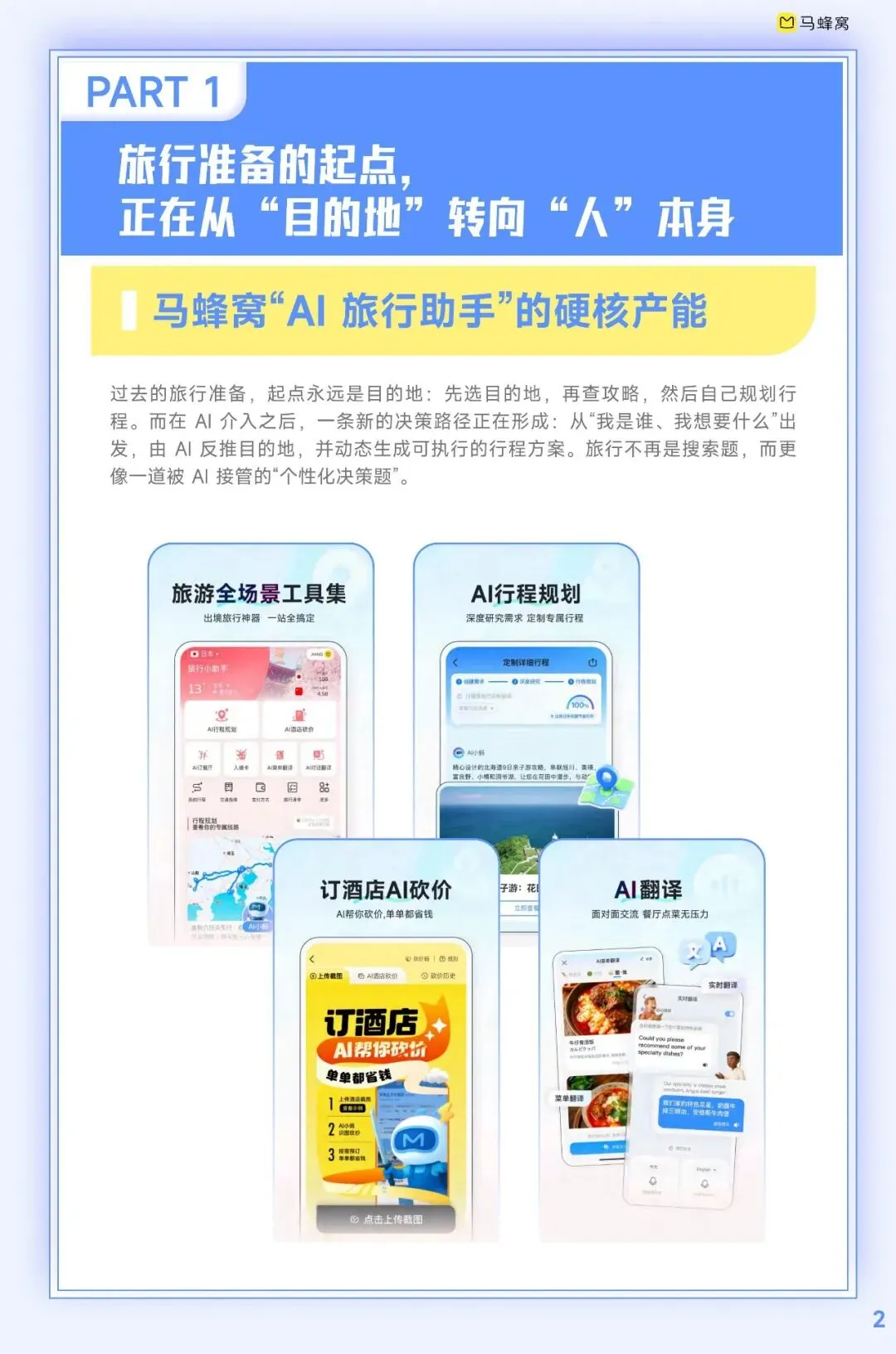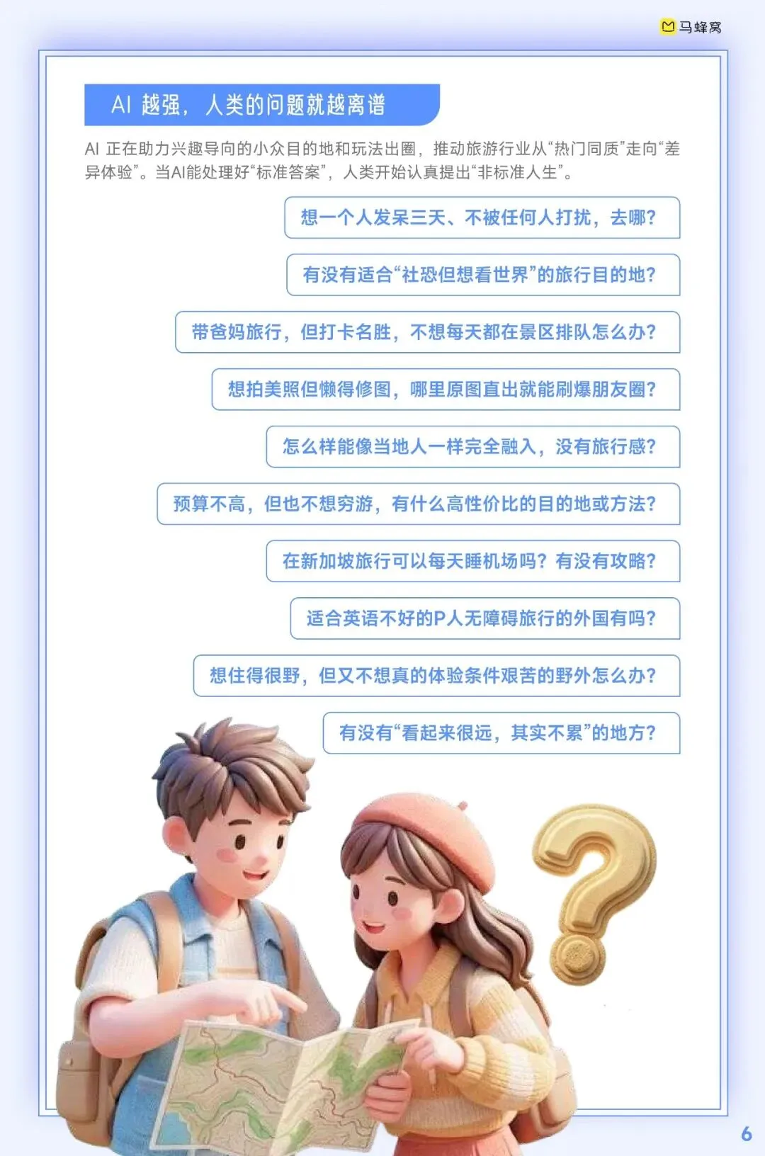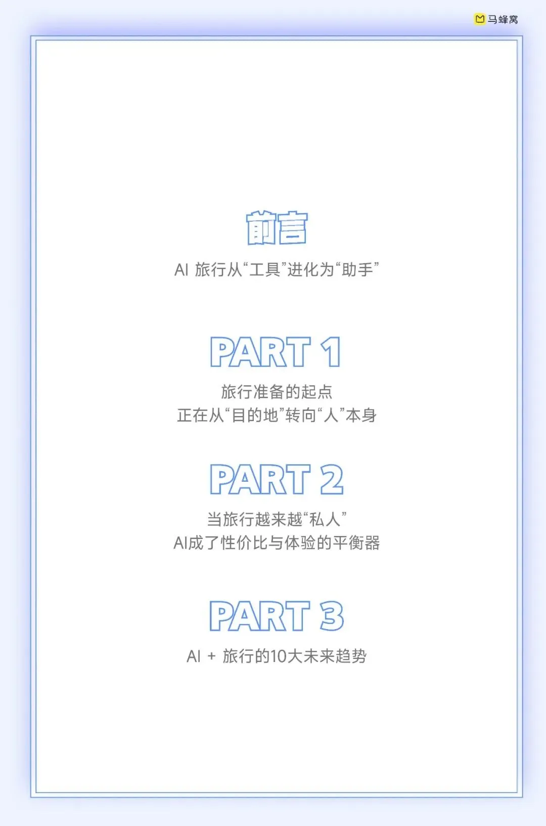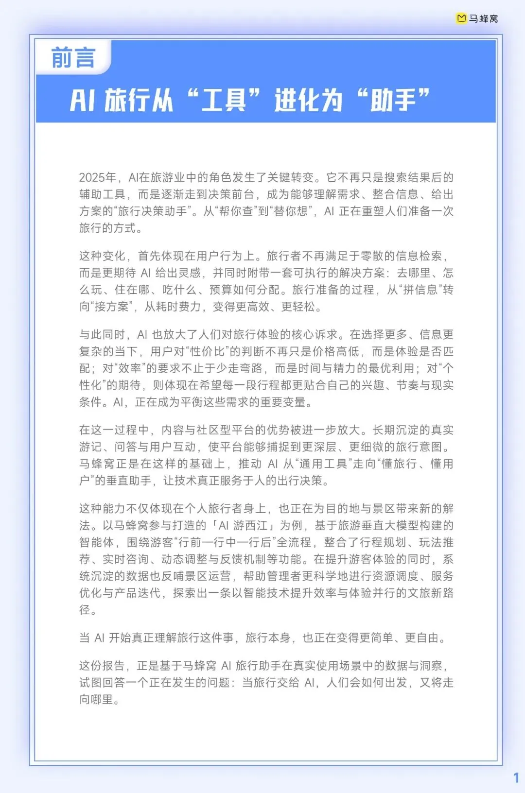 人工智能在旅游业的角色完成关键转型,从辅助搜索工具升级为深度参与决策的旅行助手,推动旅游准备逻辑从以目的地为起点转向以用户需求为核心。旅行者对旅行体验的诉求愈发多元,既追求个性化、深度化的出行感受,也注重性价比与时间精力的最优利用,AI则成为平衡这类需求的核心变量。垂直旅游平台依托沉淀的真实用户内容,让AI实现从通用工具到懂旅行、懂用户的专属助手的进阶,不仅为个人旅行者提供全流程的行程规划、消费优化等服务,也为文旅目的地打造了全链路智能服务体系,反哺景区运营与资源调度。基于马蜂窝AI旅行助手的真实场景数据与实践洞察,本报告梳理了AI介入后旅游行业的用户行为、需求特征与市场变化,剖析人工智能与旅游融合的现状,并提出未来发展的十大趋势,为理解AI重构旅游行业的逻辑与方向提供参考。