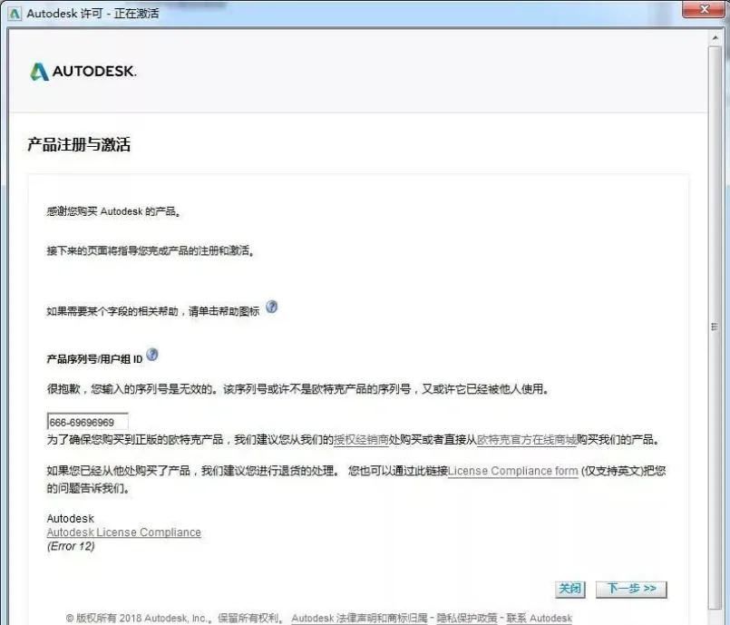13.点击关闭后会自动回到第10步激活界面,这时重新操作第10、11步即可出现以下窗口,开始下面的破解步骤。