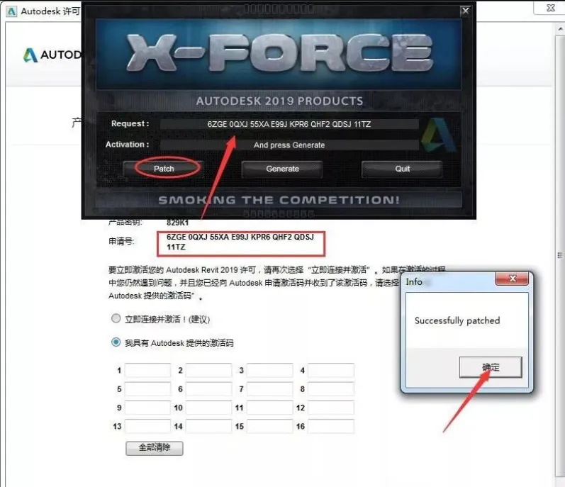 15.将“申请号”复制(ctrl+c)到"Request"框内(ctrl+v),点击“Patch”,在弹出的对话框点击确定。