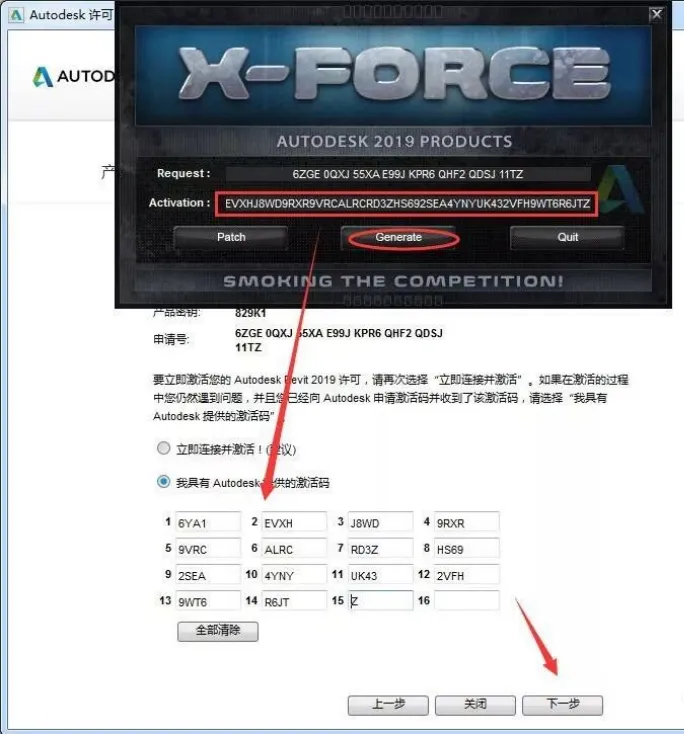 16.点击“Generate”生成激活码,将得到的激活码复制到图示框内,点击下一步。