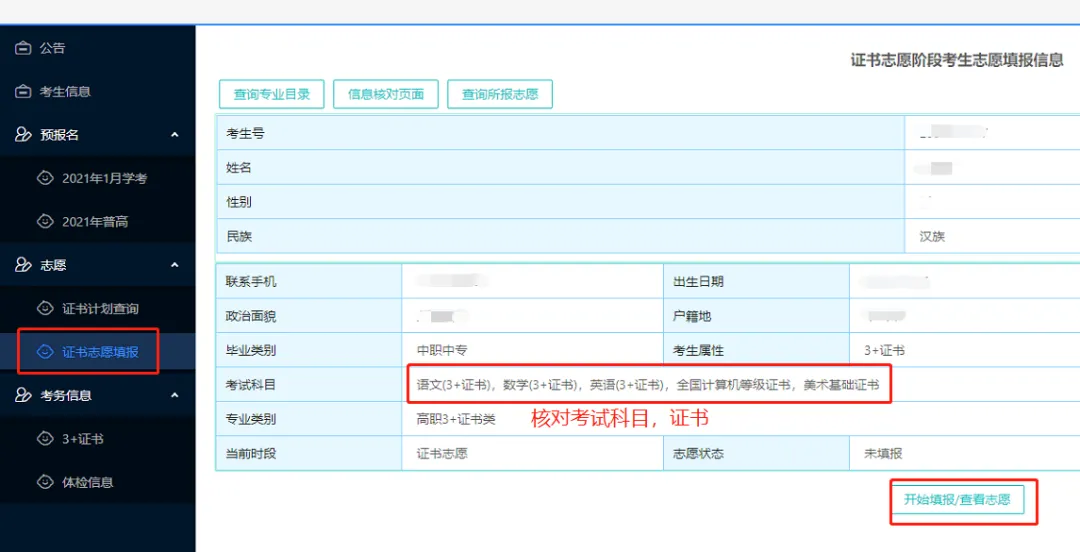 选择【证书志愿填报】,核对相关信息。