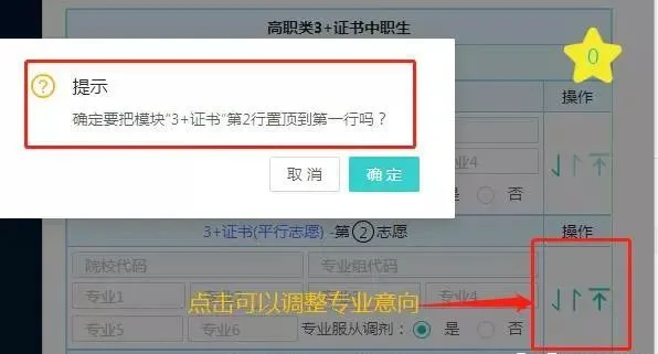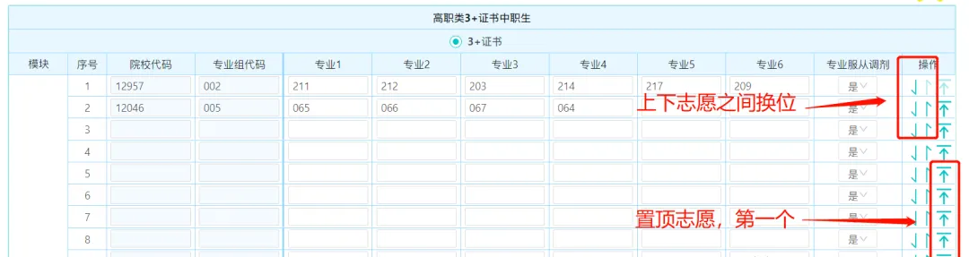 现在志愿是默认服从的!表的右边可以很容易调换志愿之间的位置!