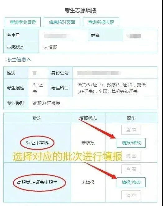 核对考生信息,进入对应批次填报。