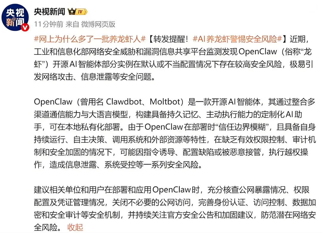 3月10日,工信部紧急发布风险提示:OpenClaw在默认或不当配置情况下存在较高安全风险,极易引发网络攻击、信息泄露。国家互联网应急中心也发出警告:已出现“误操作”风险、功能插件投毒风险。