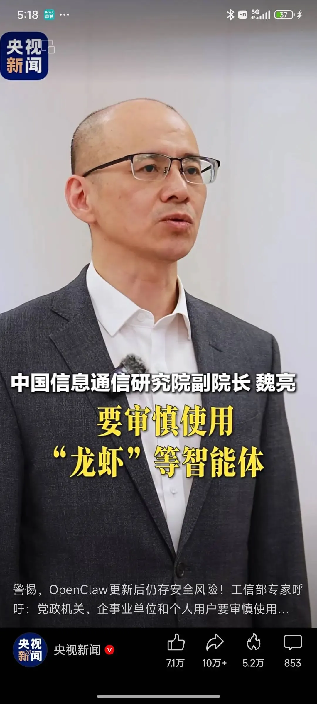 工信部、国家互联网应急中心近期连发风险提示,明确OpenClaw(龙虾)开源AI智能体存在高危安全风险,即便升级到官方最新版本修复已知漏洞,仍可能因配置不当被攻击,仅靠升级无法完全消除风险。
