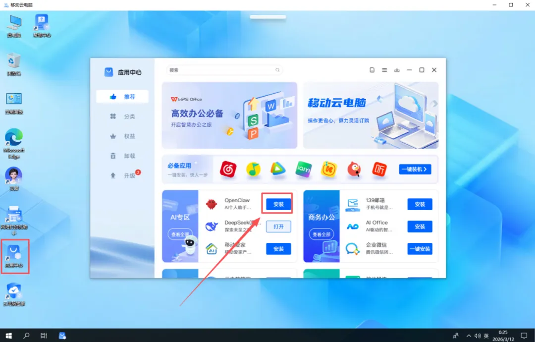 新订购移动云电脑的用户桌面预置OpenClaw,可直接双击打开使用。