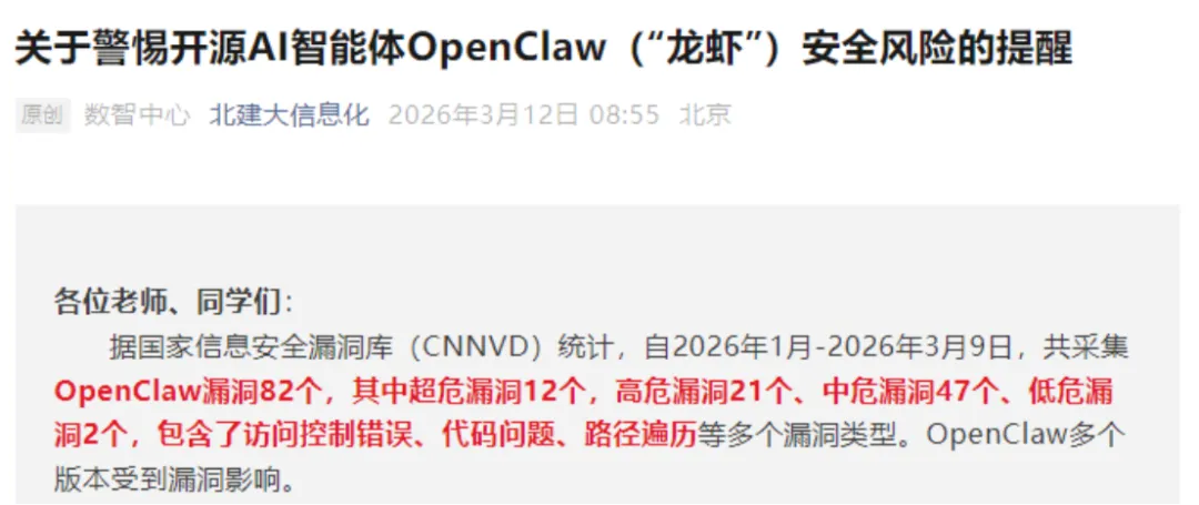 高校的密集动作并非小题大做,国家信息安全漏洞库(CNNVD)统计显示,2026年1月-3月9日,共采集OpenClaw漏洞82个,其中超危漏洞12个、高危漏洞21个、中危漏洞47个,涵盖访问控制错误、代码问题、路径遍历等多种类型,多个版本均受影响,这也是高校严控使用的核心依据。