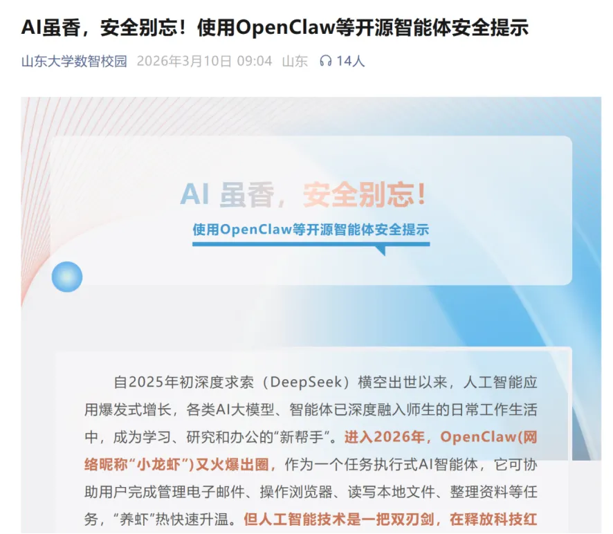 山东大学要求在测试机、Docker沙箱上安装,不得在主力电脑/办公电脑部署,配置防火墙封闭默认端口18789,做到“数据不出域”;