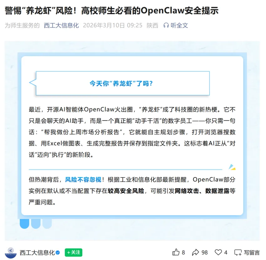 OpenClaw的爆火与争议,是AI智能体从极客工具走向大众市场的一个缩影,它展现了AI自动化的巨大潜力,也暴露了新技术在安全、规范方面的短板。面对这股“养龙虾”热潮,个人、高校/企业、行业都需要找到适合的应对方式,让效率与安全并行。