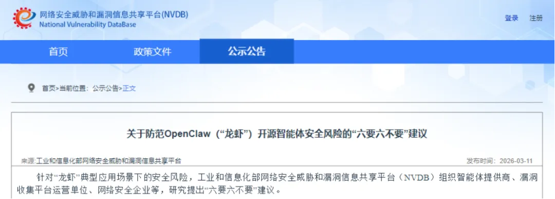 而在高校之外,工业和信息化部网络安全威胁和漏洞信息共享平台(NVDB)早已两次发布官方预警,2月5日发布《关于防范OpenClaw开源AI智能体安全风险的预警提示》,3月11日进一步推出《关于防范OpenClaw(“龙虾”)开源智能体安全风险的“六要六不要”建议》,要求相关单位和个人核查公网暴露、权限配置等情况,防范网络攻击和信息泄露。