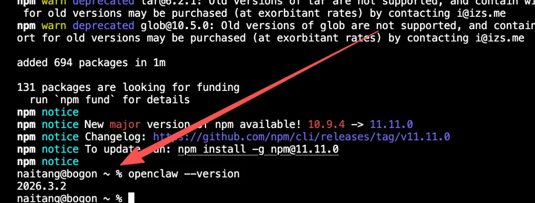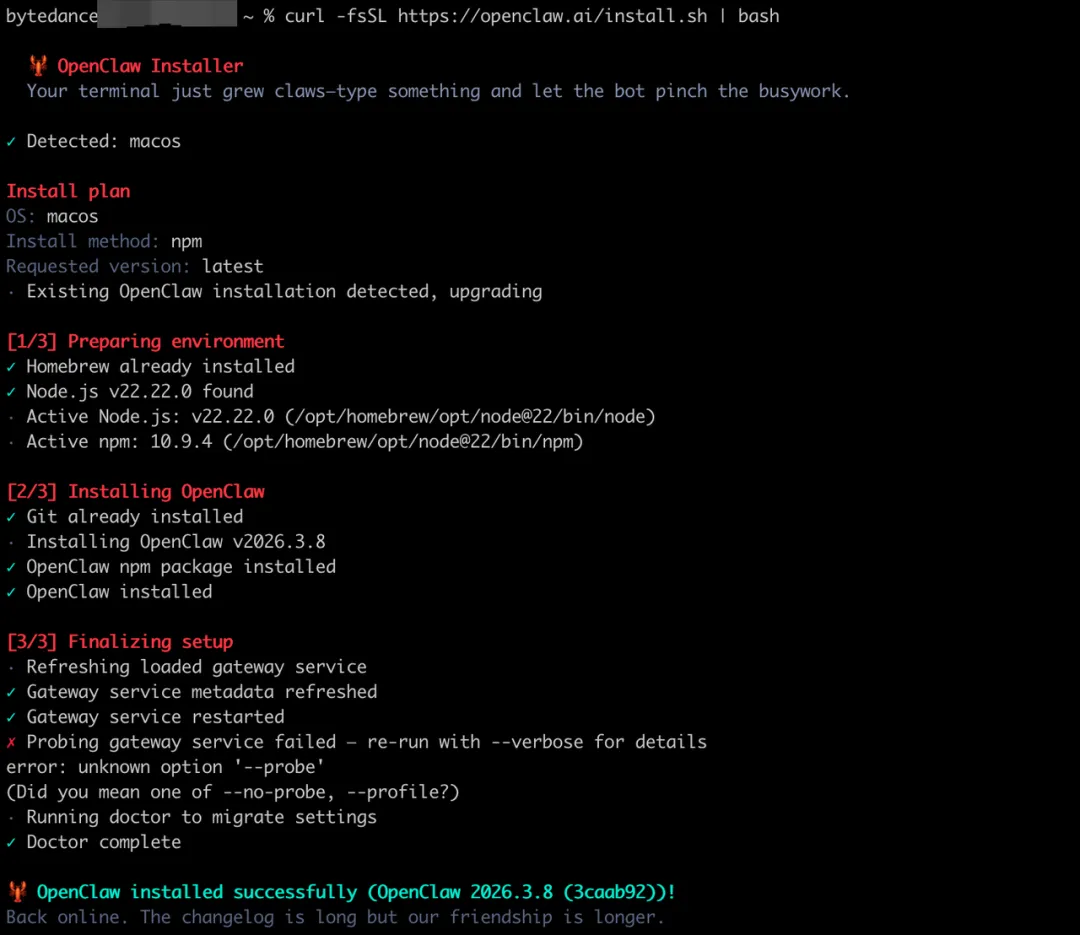 根据官方指南,执行以下安装命令,安装 OpenClaw: