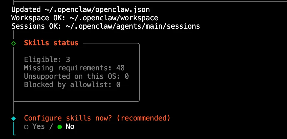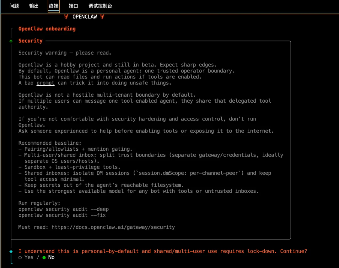 :你会看到一句提示 I understand this is powerful and inherently risky. Continue?,直接输入 Yes 并回车。这是因为 OpenClaw 可以操作你的电脑,需要你明确授权。