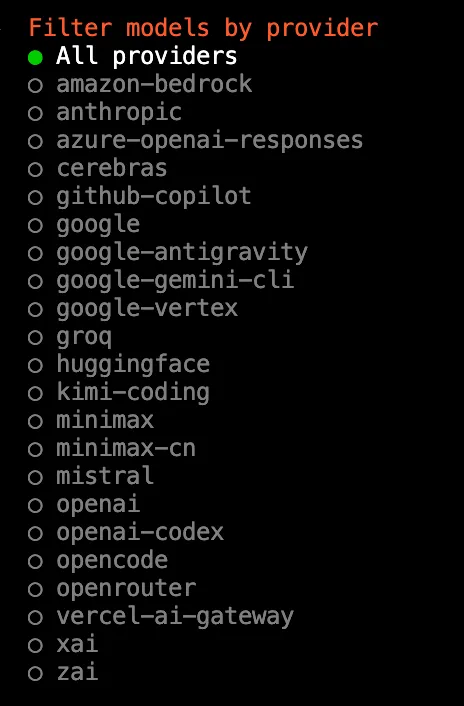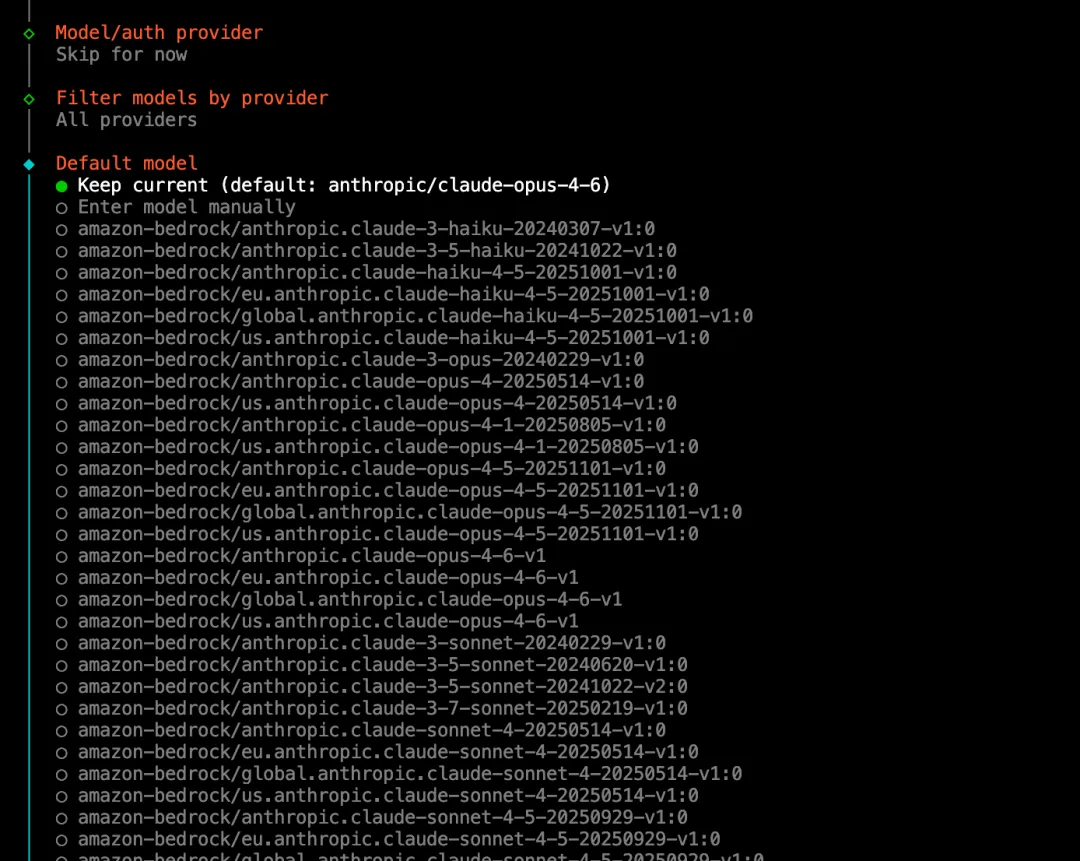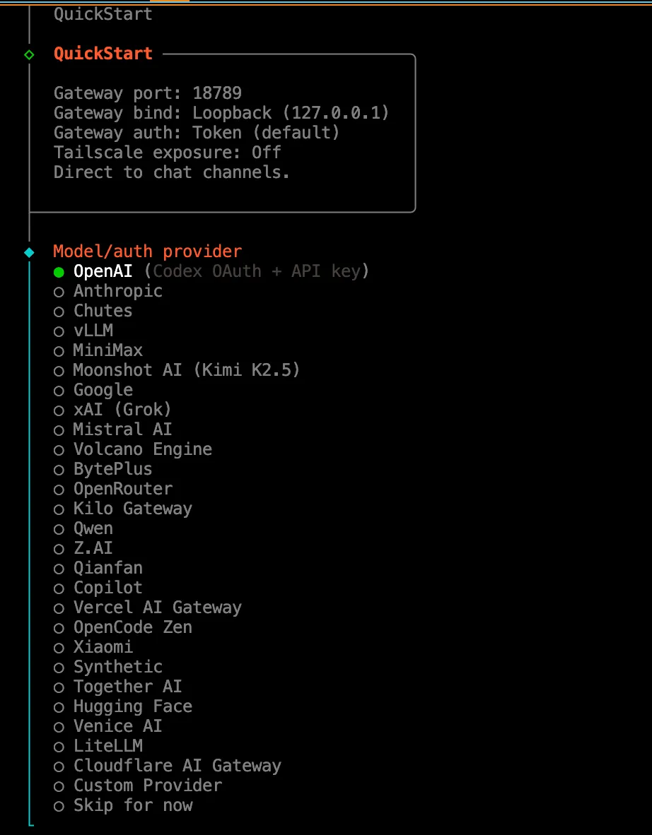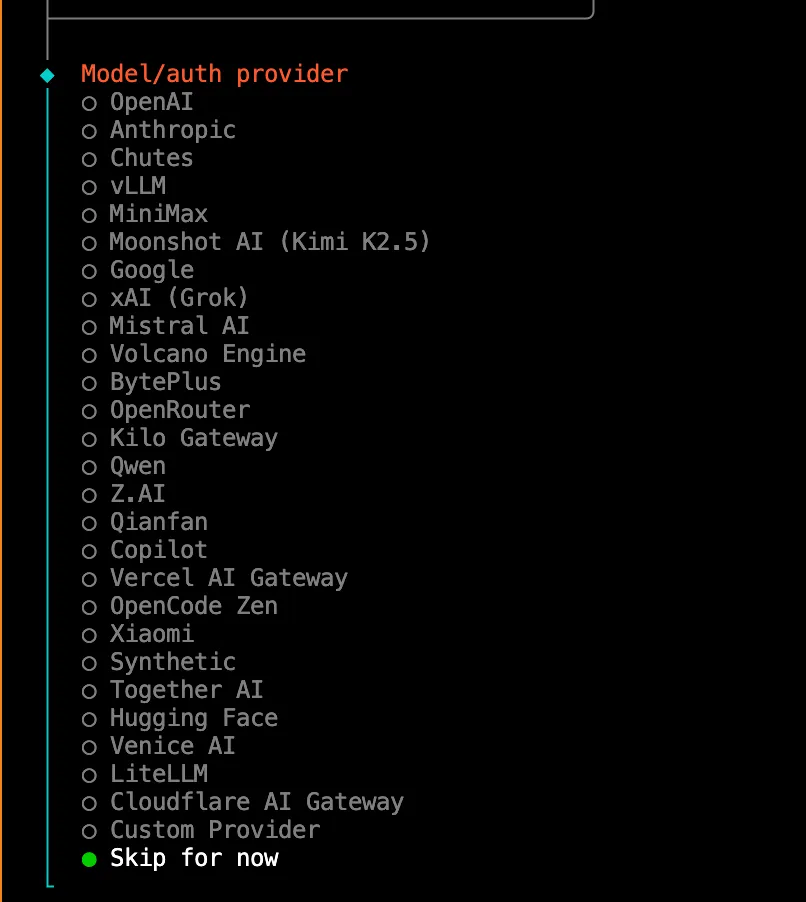:选择你希望使用的模型供应商。如果你还没有 API Key,可以先选择 “Skip for now” 跳过,后续在网页界面配置也一样方便。 - Filter models by provider