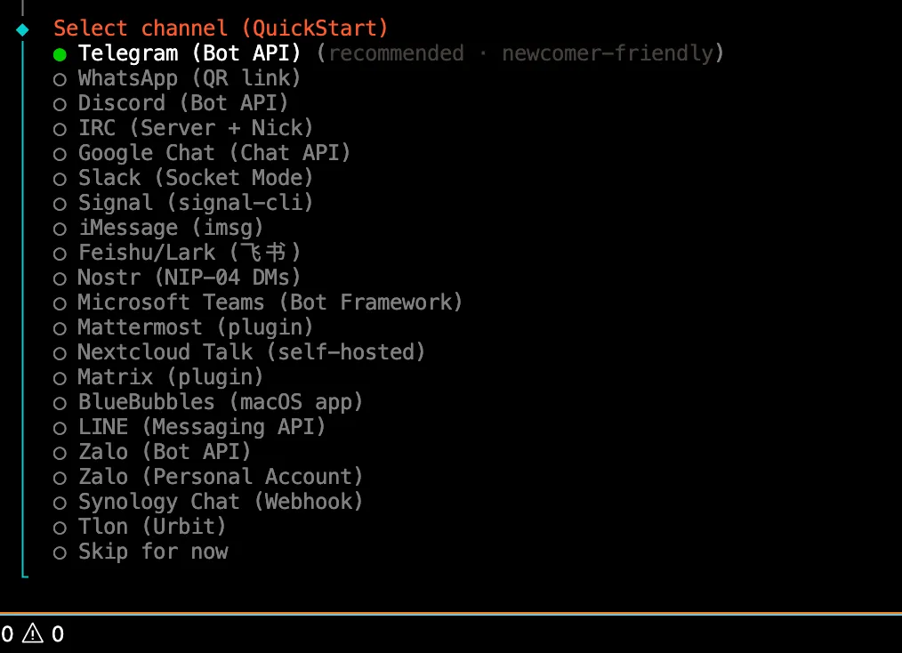:问你想通过什么软件和它聊天,比如 Telegram、飞书。第一次尝试,建议选择 “Skip for now” 跳过,我们先使用它自带的网页版界面。