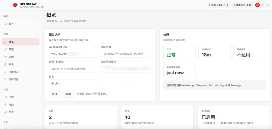openclaw gateway restart随后再打开你的网页端(http://localhost:18789),看到[2]Feishu 就代表成功了!