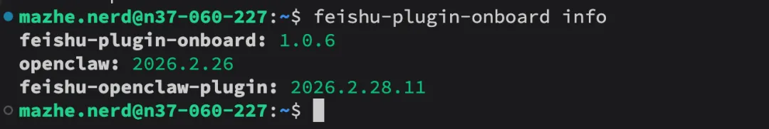 验证是否安装成功:在飞书对话中发送 /feishu start。若返回了版本号信息,则代表安装成功。