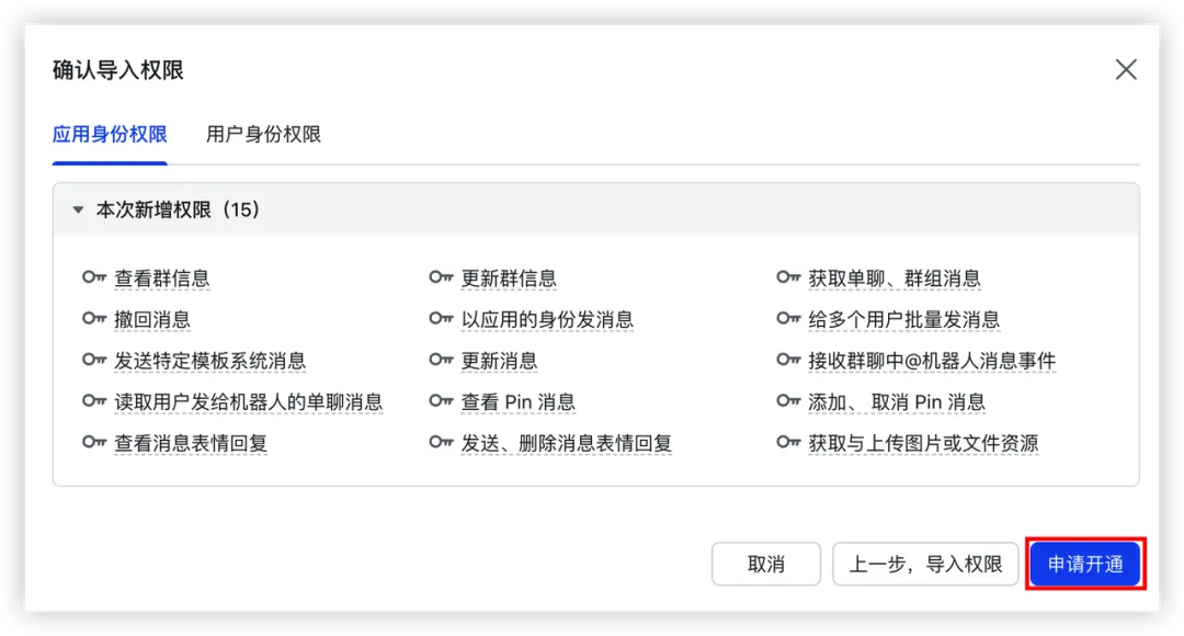 搜索并开通以下应用身份权限: im:message(核心权限,必须开通)其他相关权限根据需求开通 配置完成后,在 「版本管理与发布」 页面: 创建版本 发布应用
