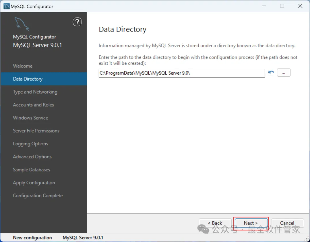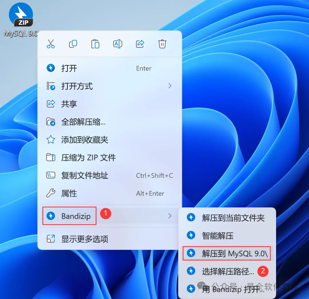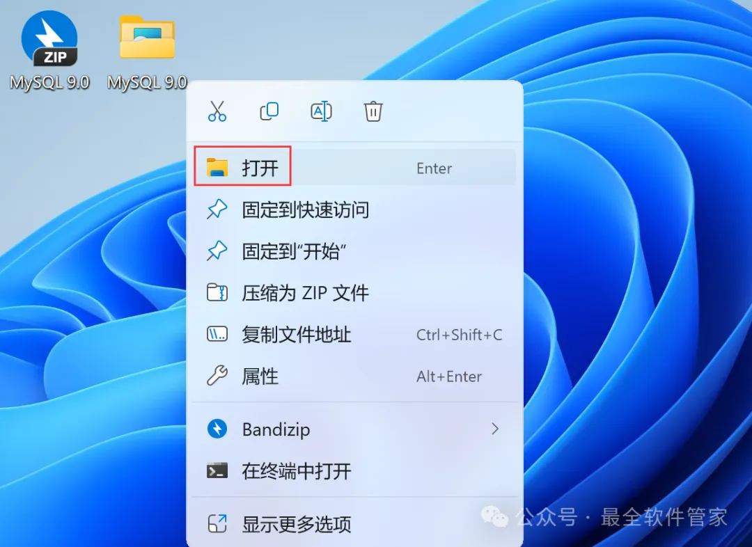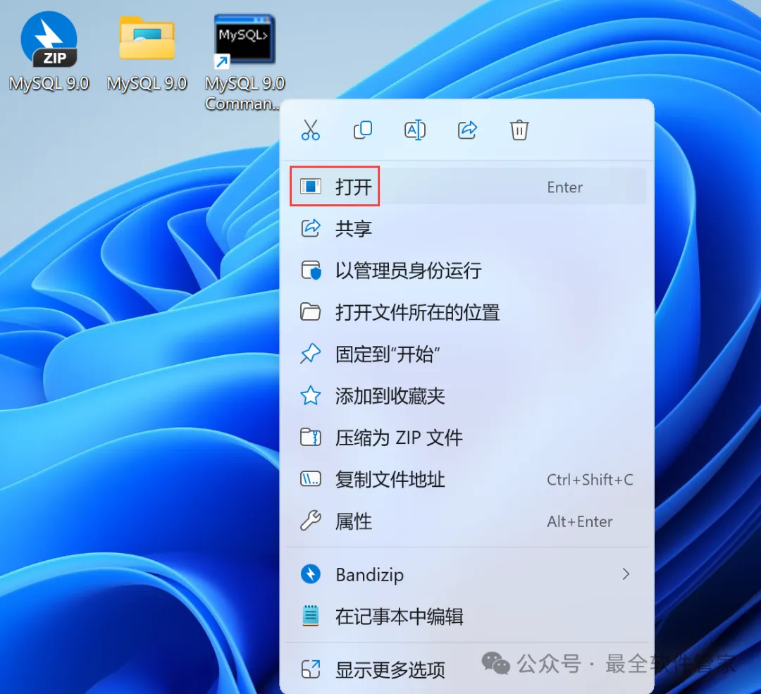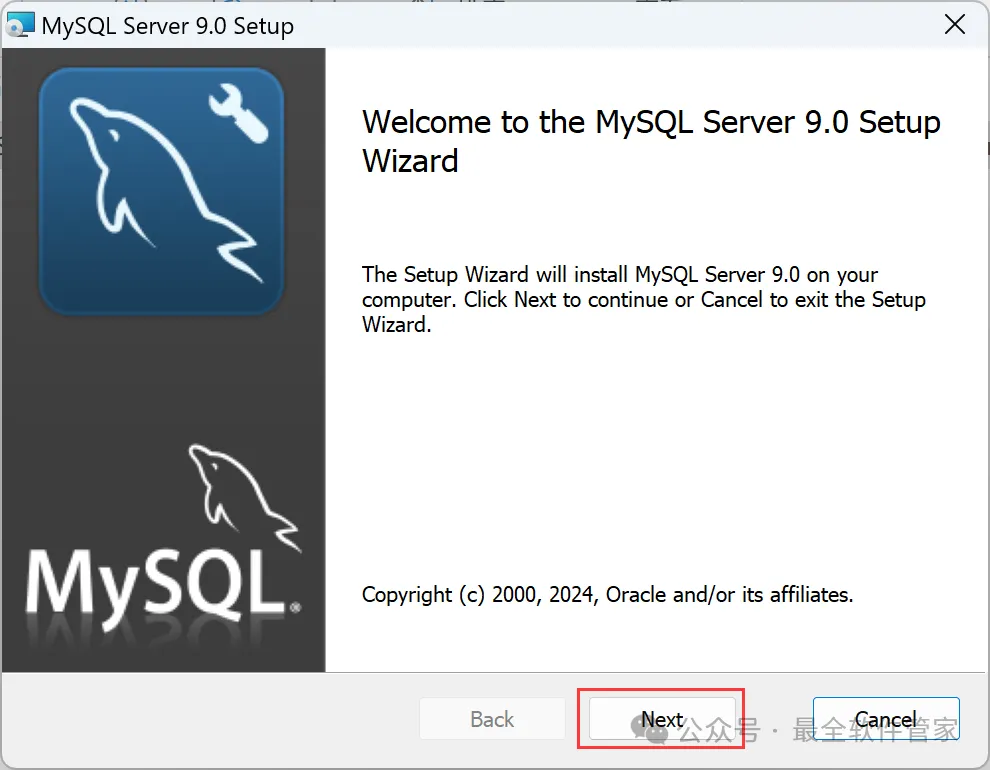 MySQL 9.0软件包下载附安装教程MySQL 9.0是最流行的关系型数据库管理系统之一,在 web 应用方面,mysql是最好的rdbms应用软件。MySQL是一种关系数据库管理系统,关系数据库将数据保存在不同的表中,而不是将所有数据放在一个大仓库内,这样就增加了速度并提高了灵活性。MySQL所使用的 sql 语言是用于访问数据库的最常用标准化语言。 [不限速下载] : 免费获取百度网盘不限速下载工具。 公众号内回复:不限速 [注意事项] : 安装前请 关闭网络、杀毒软件和防火墙 ,否则易安装失败。 公众号内回复:1 [解压软件] : 小编用的解压软件是Bandizip,获取Bandizip软件安装包。 公众号内回复:2 1、下载MySQL 9.0软件安装包到电脑上,右键选择【解压到MySQL 9.0\】 7、软件默认安装在C盘,可自定义更改软件安装位置,这里小编选择安装在D盘;点击【Next】 15、两个输入框内设置输入相同密码,再点击【Next】 23、回到桌面,点击任务栏的【开始菜单】,在【所有应用】中找到【MySQL 9.0 CommandLineClient软件图标】,将软件图标拖到桌面上,完成软件桌面快捷方式的创建 24、右键桌面上的【MySQL 9.0软件图标】,点击【打开】 25、输入步骤15设置的密码,按下键盘上的【Enter】回车键,得到以下信息,则MySQL 9.0安装成功 26、以上就是MySQL 9.0软件安装的全过程,要是对你有帮助的话,请为小编点个赞! 免责声明:软件资源均来源于网络,仅供用户交流学习与研究使用,版权归属原版权方所有,版权争议与本公众号无关,用户本人下载后不能用作商业或非法用途,否则后果均由用户承担责任;如果您访问和下载此文件,表示您同意只将此软件用于参考、学习而非其他用途,否则一切后果请您自行承担,请于下载后24小时内删除,不允许用于商业用途,否则法律问题自行承担。如果您喜欢该软件,请支持正版软件,购买注册,得到更好的正版服务。