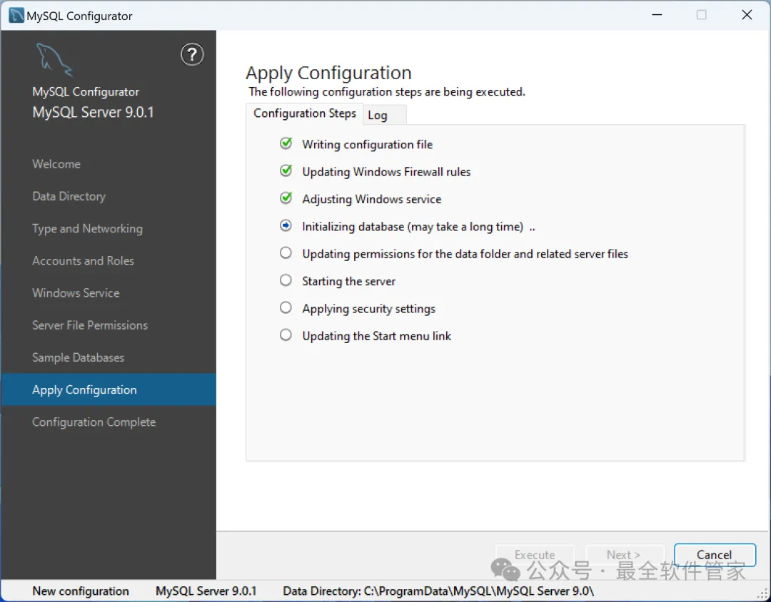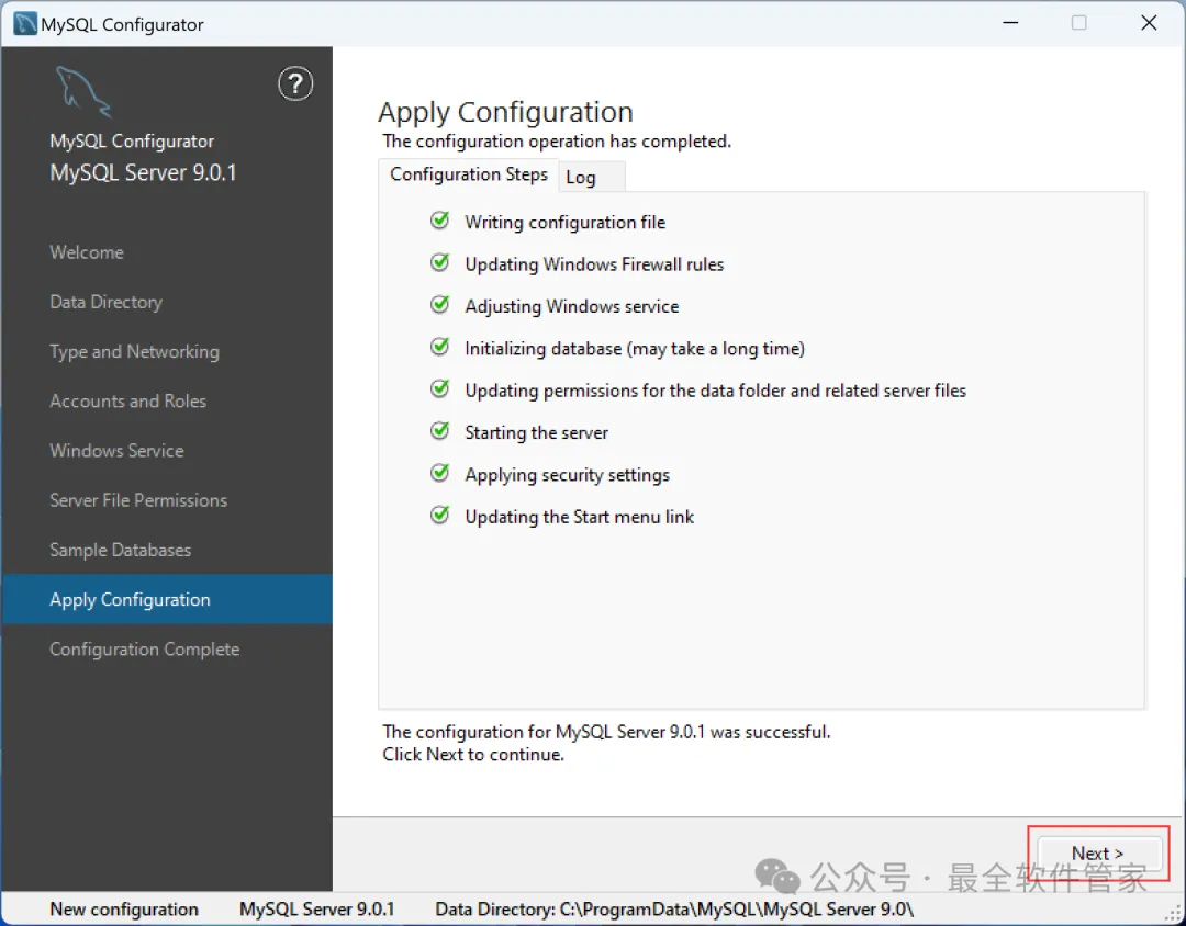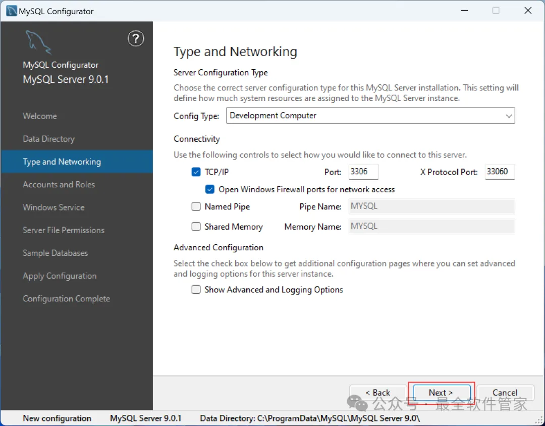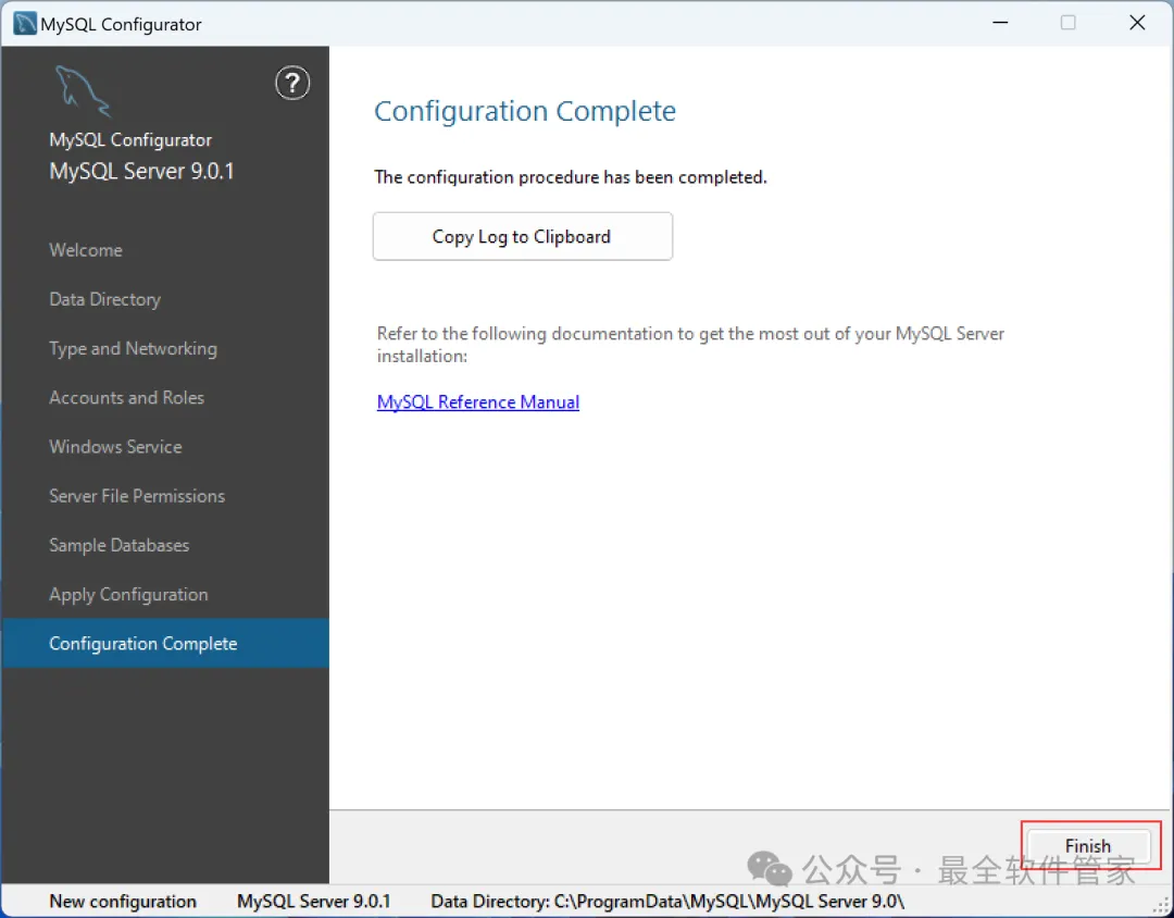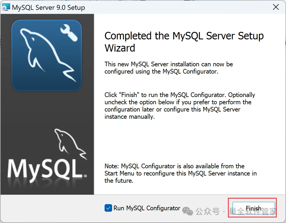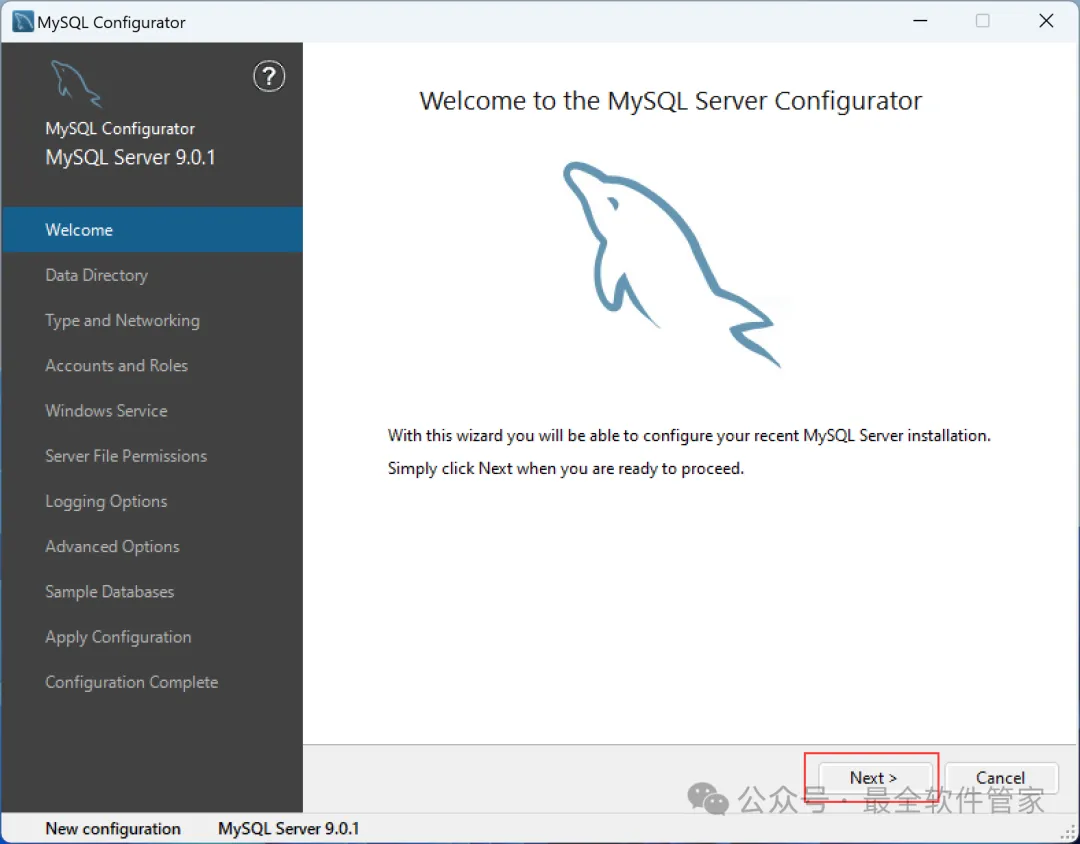 MySQL 9.0软件包下载附安装教程MySQL 9.0是最流行的关系型数据库管理系统之一,在 web 应用方面,mysql是最好的rdbms应用软件。MySQL是一种关系数据库管理系统,关系数据库将数据保存在不同的表中,而不是将所有数据放在一个大仓库内,这样就增加了速度并提高了灵活性。MySQL所使用的 sql 语言是用于访问数据库的最常用标准化语言。 [不限速下载] : 免费获取百度网盘不限速下载工具。 公众号内回复:不限速 [注意事项] : 安装前请 关闭网络、杀毒软件和防火墙 ,否则易安装失败。 公众号内回复:1 [解压软件] : 小编用的解压软件是Bandizip,获取Bandizip软件安装包。 公众号内回复:2 1、下载MySQL 9.0软件安装包到电脑上,右键选择【解压到MySQL 9.0\】 7、软件默认安装在C盘,可自定义更改软件安装位置,这里小编选择安装在D盘;点击【Next】 15、两个输入框内设置输入相同密码,再点击【Next】 23、回到桌面,点击任务栏的【开始菜单】,在【所有应用】中找到【MySQL 9.0 CommandLineClient软件图标】,将软件图标拖到桌面上,完成软件桌面快捷方式的创建 24、右键桌面上的【MySQL 9.0软件图标】,点击【打开】 25、输入步骤15设置的密码,按下键盘上的【Enter】回车键,得到以下信息,则MySQL 9.0安装成功 26、以上就是MySQL 9.0软件安装的全过程,要是对你有帮助的话,请为小编点个赞! 免责声明:软件资源均来源于网络,仅供用户交流学习与研究使用,版权归属原版权方所有,版权争议与本公众号无关,用户本人下载后不能用作商业或非法用途,否则后果均由用户承担责任;如果您访问和下载此文件,表示您同意只将此软件用于参考、学习而非其他用途,否则一切后果请您自行承担,请于下载后24小时内删除,不允许用于商业用途,否则法律问题自行承担。如果您喜欢该软件,请支持正版软件,购买注册,得到更好的正版服务。