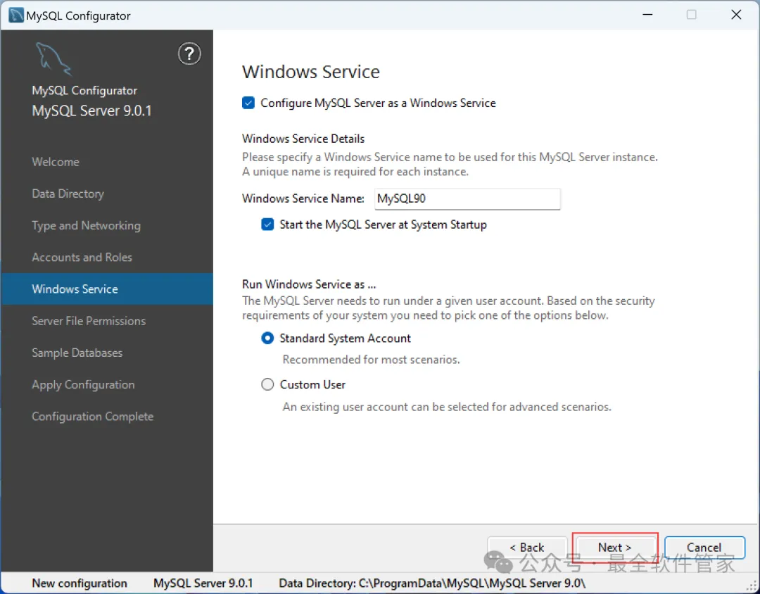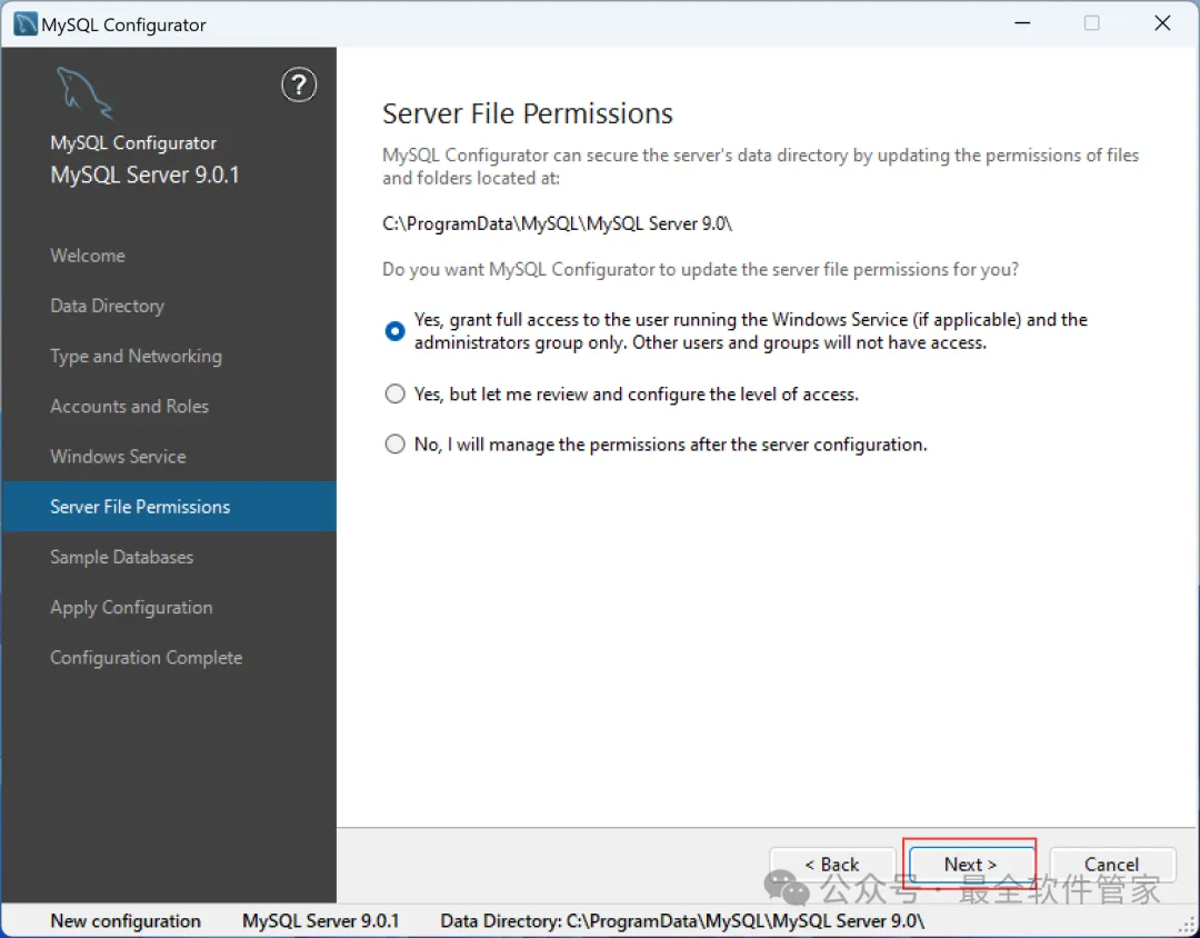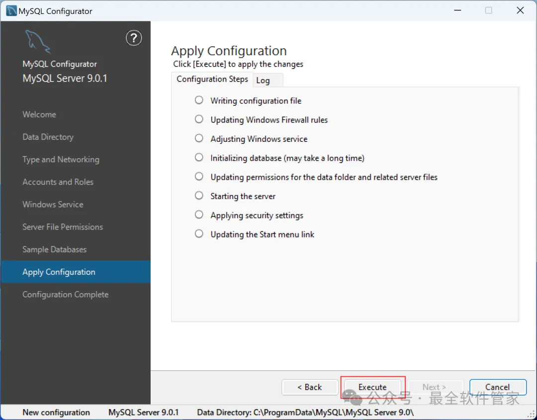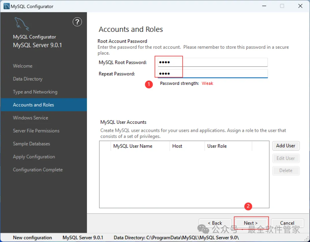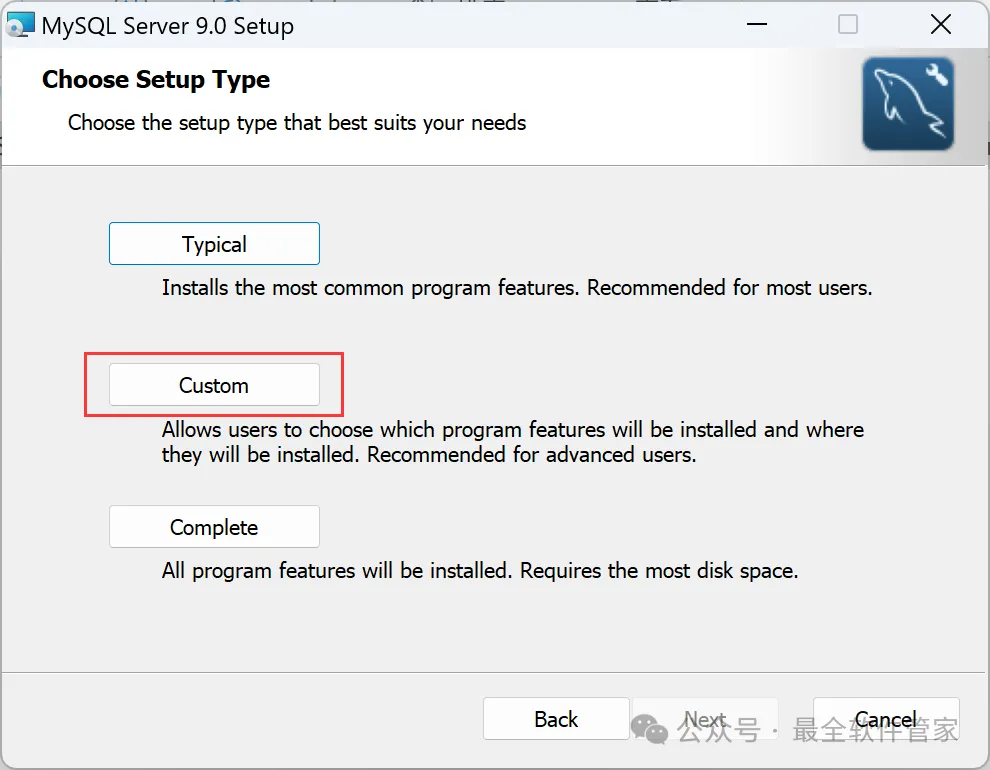 MySQL 9.0软件包下载附安装教程MySQL 9.0是最流行的关系型数据库管理系统之一,在 web 应用方面,mysql是最好的rdbms应用软件。MySQL是一种关系数据库管理系统,关系数据库将数据保存在不同的表中,而不是将所有数据放在一个大仓库内,这样就增加了速度并提高了灵活性。MySQL所使用的 sql 语言是用于访问数据库的最常用标准化语言。 [不限速下载] : 免费获取百度网盘不限速下载工具。 公众号内回复:不限速 [注意事项] : 安装前请 关闭网络、杀毒软件和防火墙 ,否则易安装失败。 公众号内回复:1 [解压软件] : 小编用的解压软件是Bandizip,获取Bandizip软件安装包。 公众号内回复:2 1、下载MySQL 9.0软件安装包到电脑上,右键选择【解压到MySQL 9.0\】 7、软件默认安装在C盘,可自定义更改软件安装位置,这里小编选择安装在D盘;点击【Next】 15、两个输入框内设置输入相同密码,再点击【Next】 23、回到桌面,点击任务栏的【开始菜单】,在【所有应用】中找到【MySQL 9.0 CommandLineClient软件图标】,将软件图标拖到桌面上,完成软件桌面快捷方式的创建 24、右键桌面上的【MySQL 9.0软件图标】,点击【打开】 25、输入步骤15设置的密码,按下键盘上的【Enter】回车键,得到以下信息,则MySQL 9.0安装成功 26、以上就是MySQL 9.0软件安装的全过程,要是对你有帮助的话,请为小编点个赞! 免责声明:软件资源均来源于网络,仅供用户交流学习与研究使用,版权归属原版权方所有,版权争议与本公众号无关,用户本人下载后不能用作商业或非法用途,否则后果均由用户承担责任;如果您访问和下载此文件,表示您同意只将此软件用于参考、学习而非其他用途,否则一切后果请您自行承担,请于下载后24小时内删除,不允许用于商业用途,否则法律问题自行承担。如果您喜欢该软件,请支持正版软件,购买注册,得到更好的正版服务。