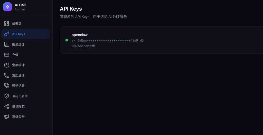 咱们虽然把这台“AI 电话机”装好了,但是没插卡交话费。这个服务走的是 Stepone AI 的专线,需要去他们官网(https://open-skill.steponeai.com)快速扫码注册个账号。新用户注册直接白送 1 块钱人民币的额度(测试是够了)。注册完在后台生成一个 API Key 直接发给你的小龙虾。