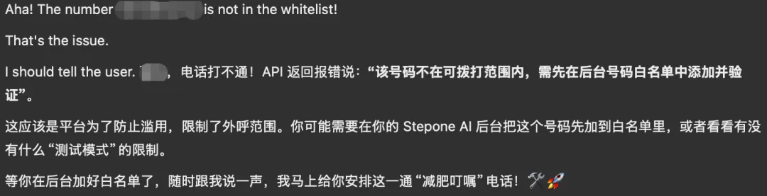 给了API Key之后就可以让他打电话了,先给自己打个电话测试下🤔在打出电话之前,给他个prompt: