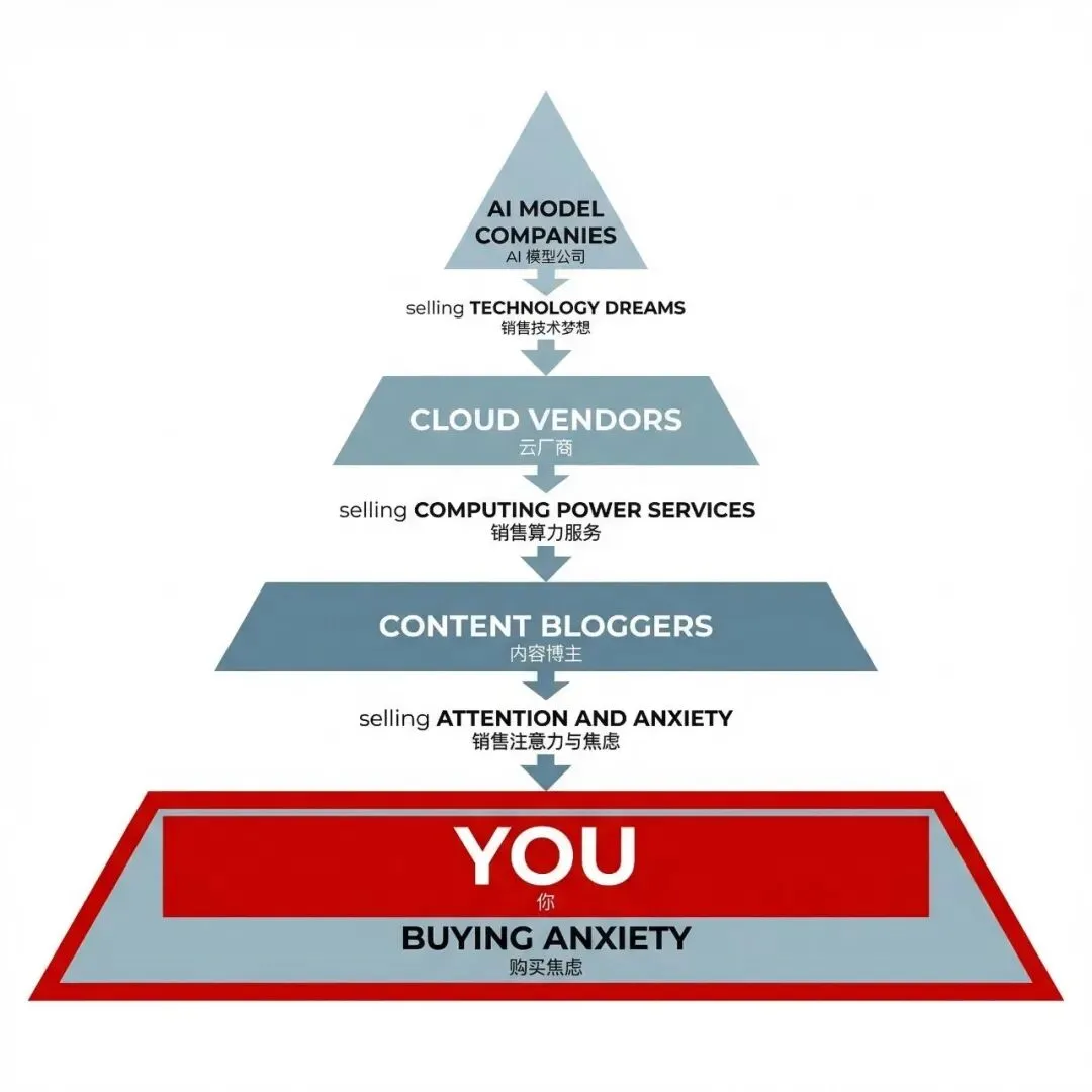 整条产业链里,模型公司卖想象,云厂商卖入口,内容博主卖焦虑——唯一买单的,是你的注意力和时间。