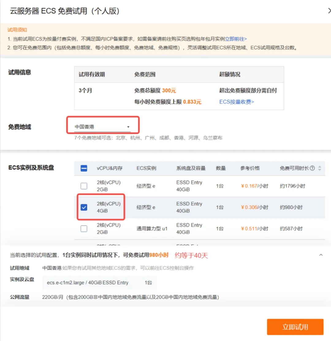 地区推荐选择【中国香港】,ECS 实例及系统盘选择【2核(vCPU)4GiB】,然后立即试用。如果有要镜像系统选择的话,就选择最新版的 Ubuntu 系统。