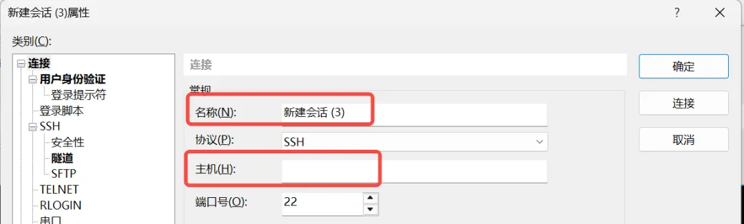 打开 Xshell 软件,按 Alt + N 新建一个会话(我已经新建过会话了,所以这里是 3 ),名称随意,主机那一栏也随意填写。