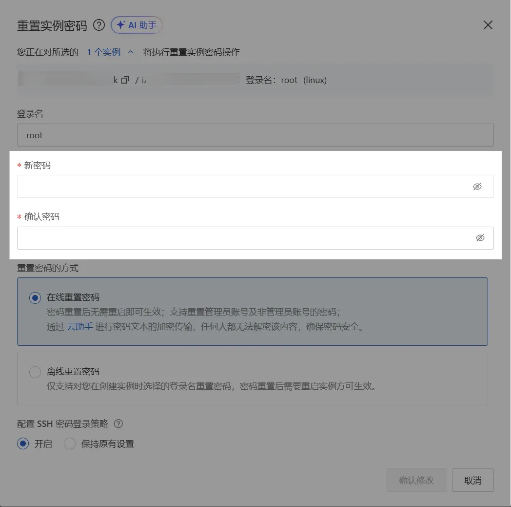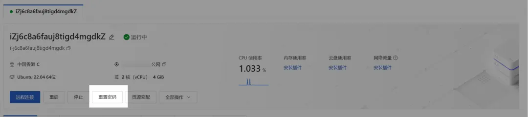 回车后会有个弹窗让你登录,先忽略,回到服务器页面,找到【设置密码】相关字样(也可能是重置密码)