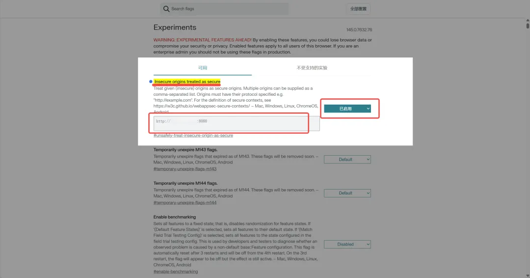 1. 在浏览器地址栏输入:chrome://flags (如果你用 Edge,输入 edge://flags) 2. 在搜索框里搜索:unsafely-treat-insecure-origin-as-secure 3. 找到这个选项后,在文本框里输入你带端口的 ZeroTier 地址,比如:http://你的ZeroTier_IP:8080