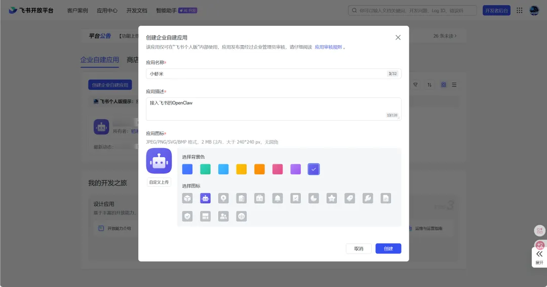 登录开发者后台:开发者后台 - 飞书开放平台,创建企业自建应用,填入相关信息。