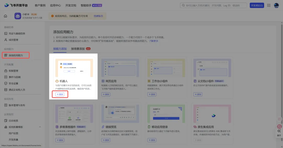 在【添加应用能力】里,选择添加一个机器人。