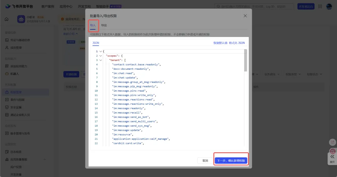 在【权限管理】中,点击【批量导入/导出权限】,将下方的代码替换到【导入】的代码框里,然后确定导入并申请开通。