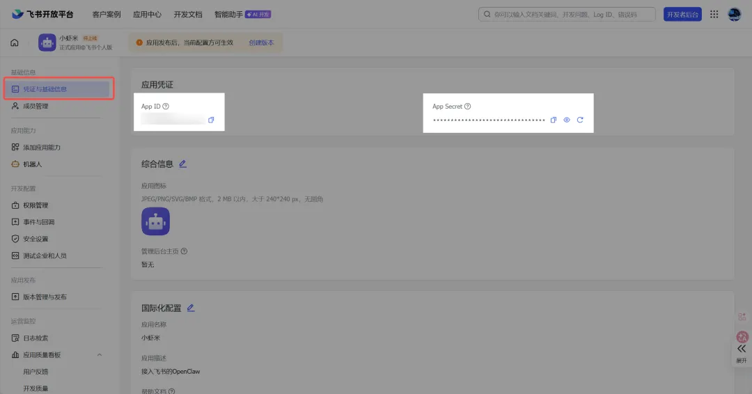 在【凭证与基础信息】中,你会看到 App ID 和 App Secret 这两个是识别应用的唯一凭证和安全密钥,务必妥善保管,谨防泄露!