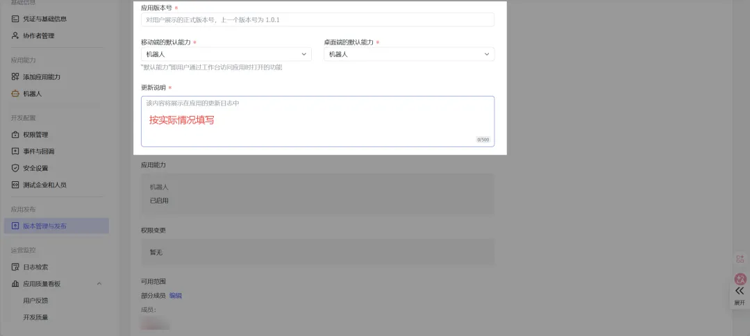 点击顶部提示框的【创建版本】按钮,填入应用的相关信息,完成后拉到最下面选择【保存】,然后发布。