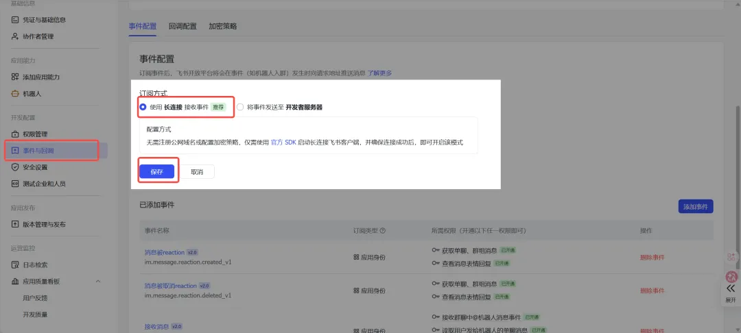 回到应用后台,在【事件配置】中选择使用 长链接 接受事件并保存。