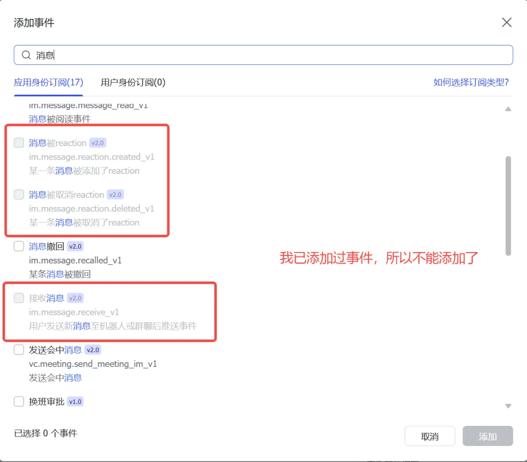 然后添加事件:接收消息、消息被reaction、消息被取消reaction。