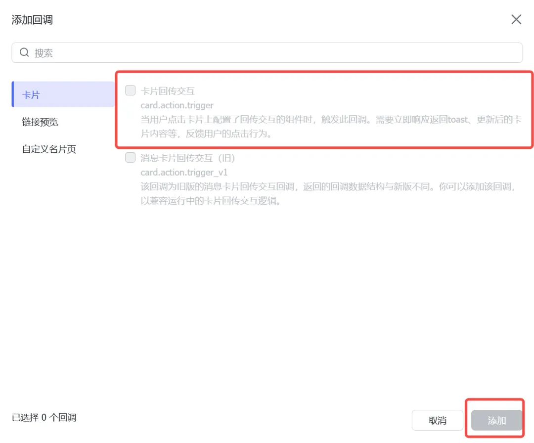 接下来选择【回调配置】,同样选择长链接配置方式,再添加一个"卡片回传交互"的回调事件。