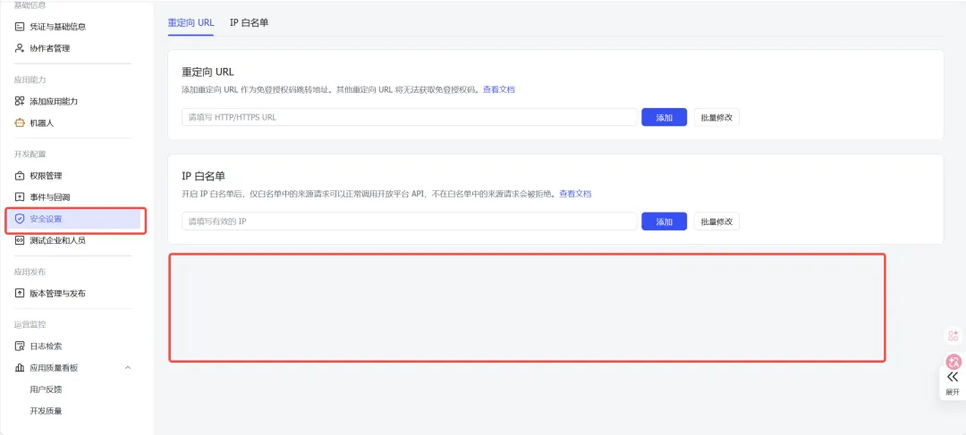 配置完成后看到【安全设置】,如果看到有 user_access_token 开关,请务必打开!没有则可以忽略。