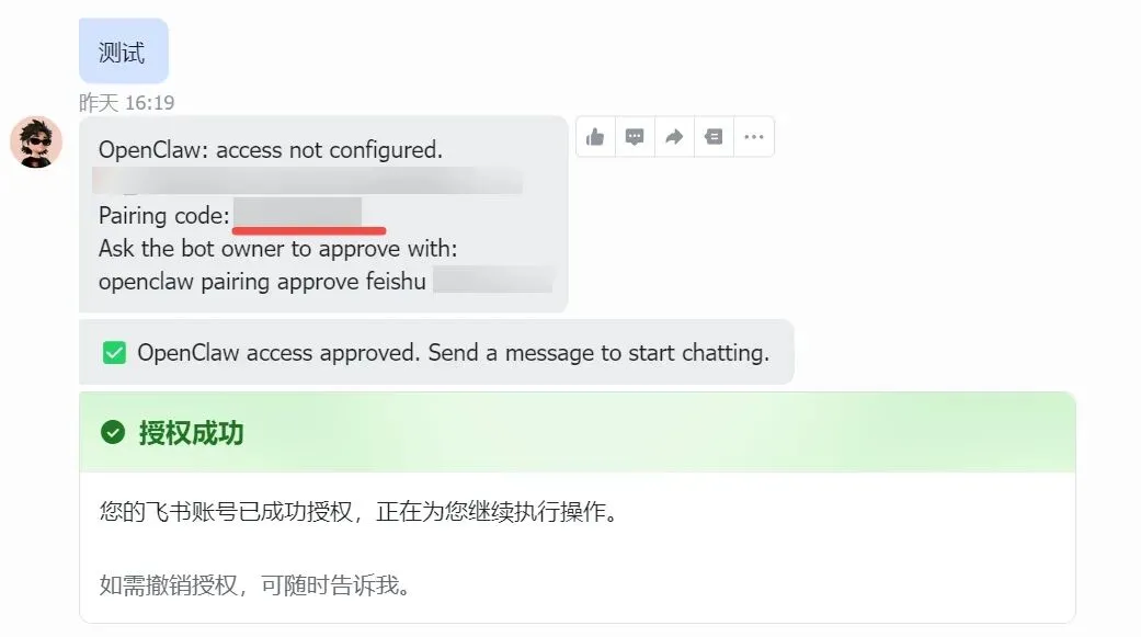 配对完后回到聊天页面,根据指引给机器人进行授权操作,完成后就可以和你的龙虾进行聊天了!